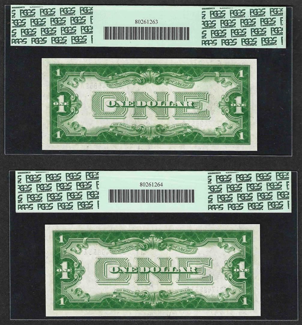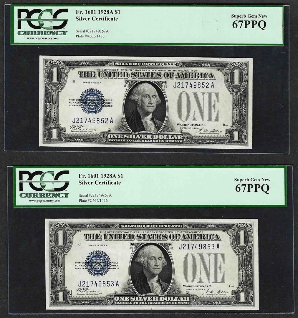 One (2) Consecutive 1928A $1 Funnyback Silver Certificate Notes PCGS Superb Gem New 67PPQ. PCGS Graded.