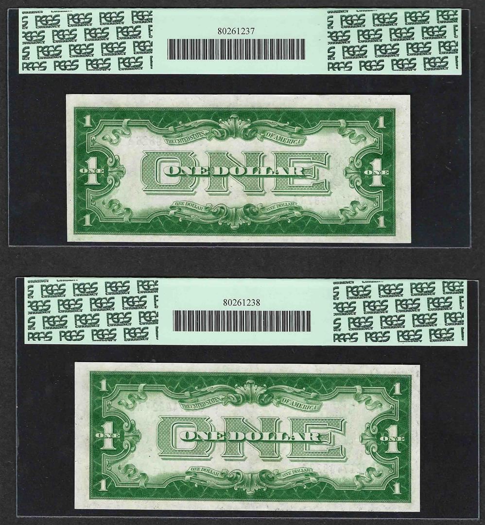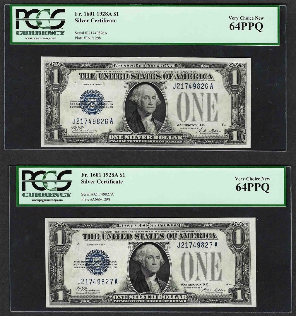 One Lot of (2) Consecutive 1928A $1 Funnyback Silver Certificate Notes PCGS Very Choice New 64PPQ. PCGS Graded.