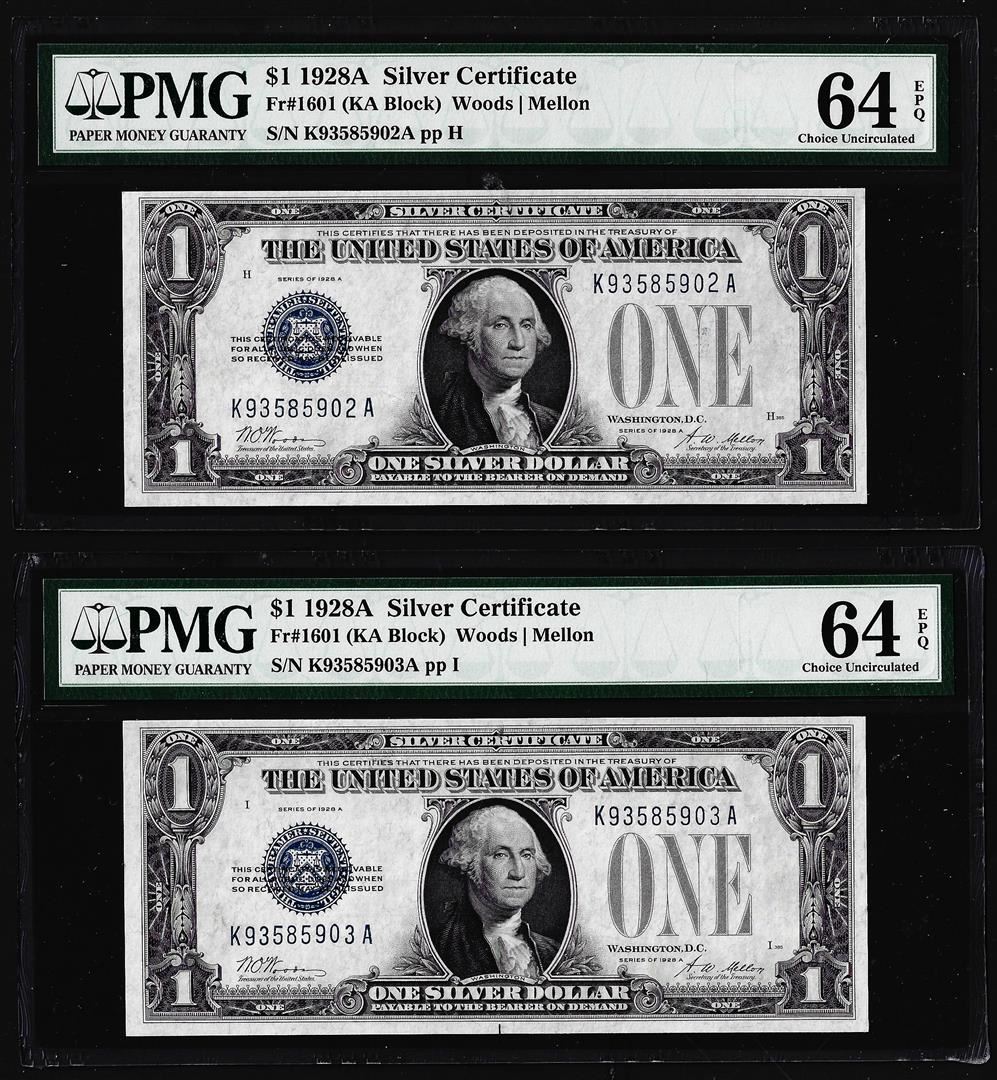 One Lot of (2) Consecutive 1928A $1 Funnyback Silver Certificate Notes Fr.1601 PMG Choice Uncirculated 64EPQ. PMG Certified.