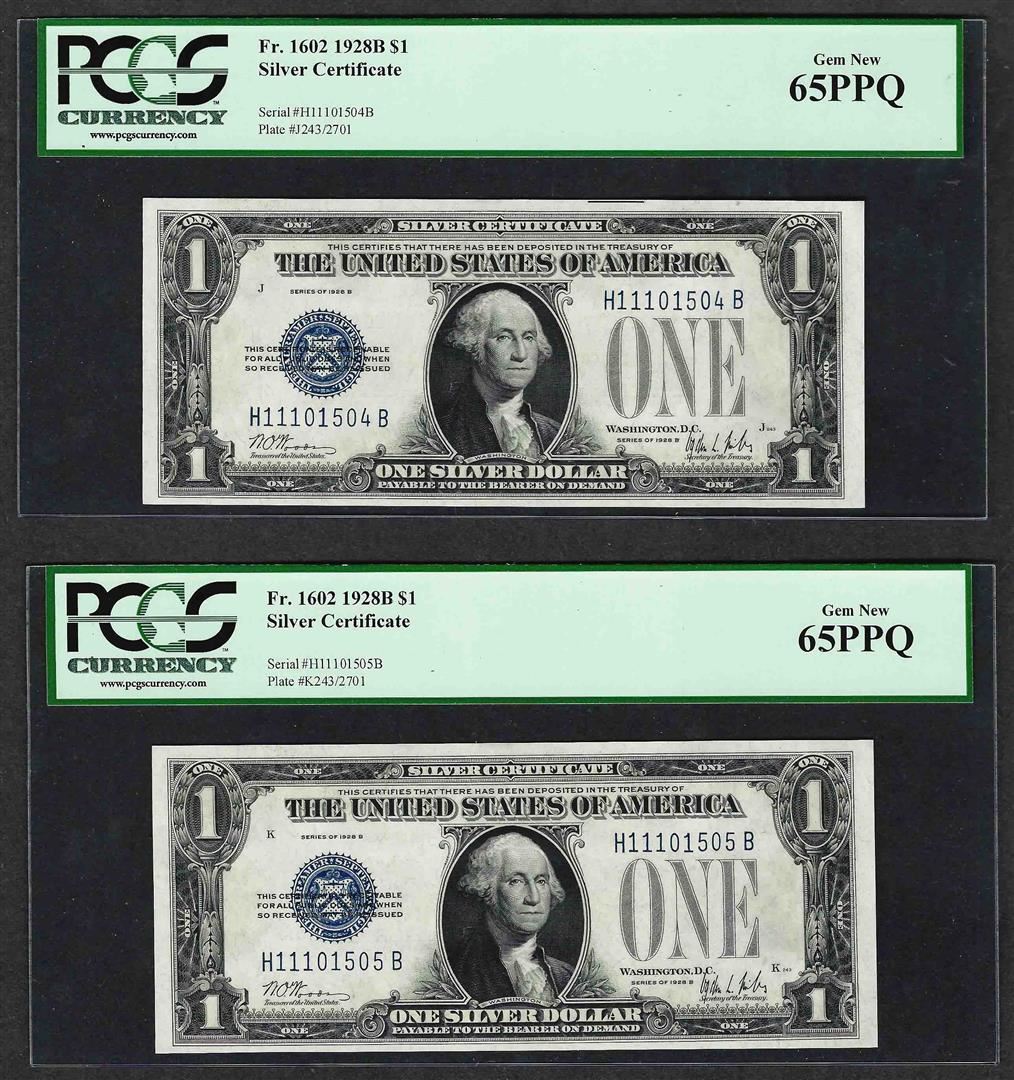One Lot of (2) Consecutive 1928B $1 Funnyback Silver Certificate Notes Fr.1602 PCGS Gem New 65PPQ. PCGS Graded.