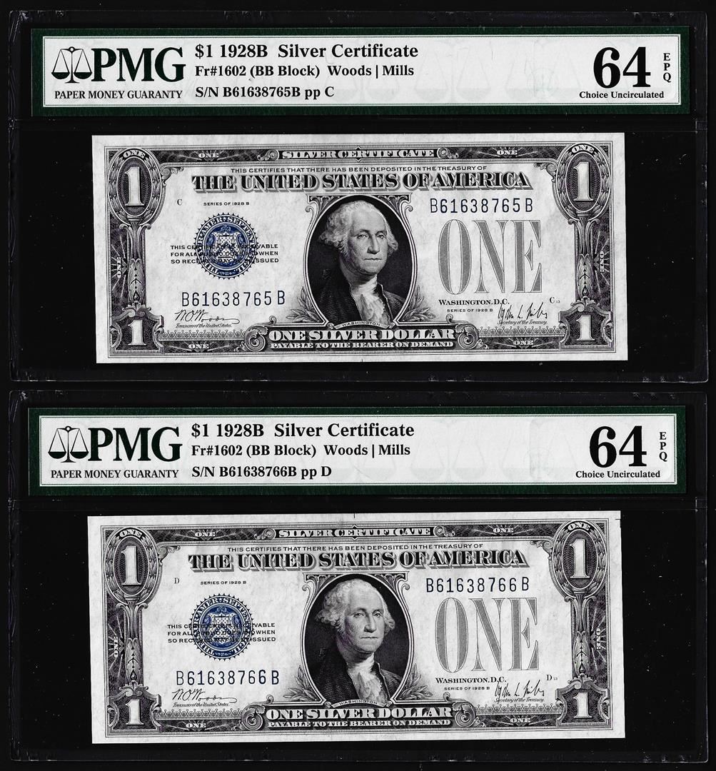 One (2) Consecutive 1928B $1 Silver Certificate Notes Fr.1602 PMG Choice Uncirculated 64EPQ. PMG Certified.