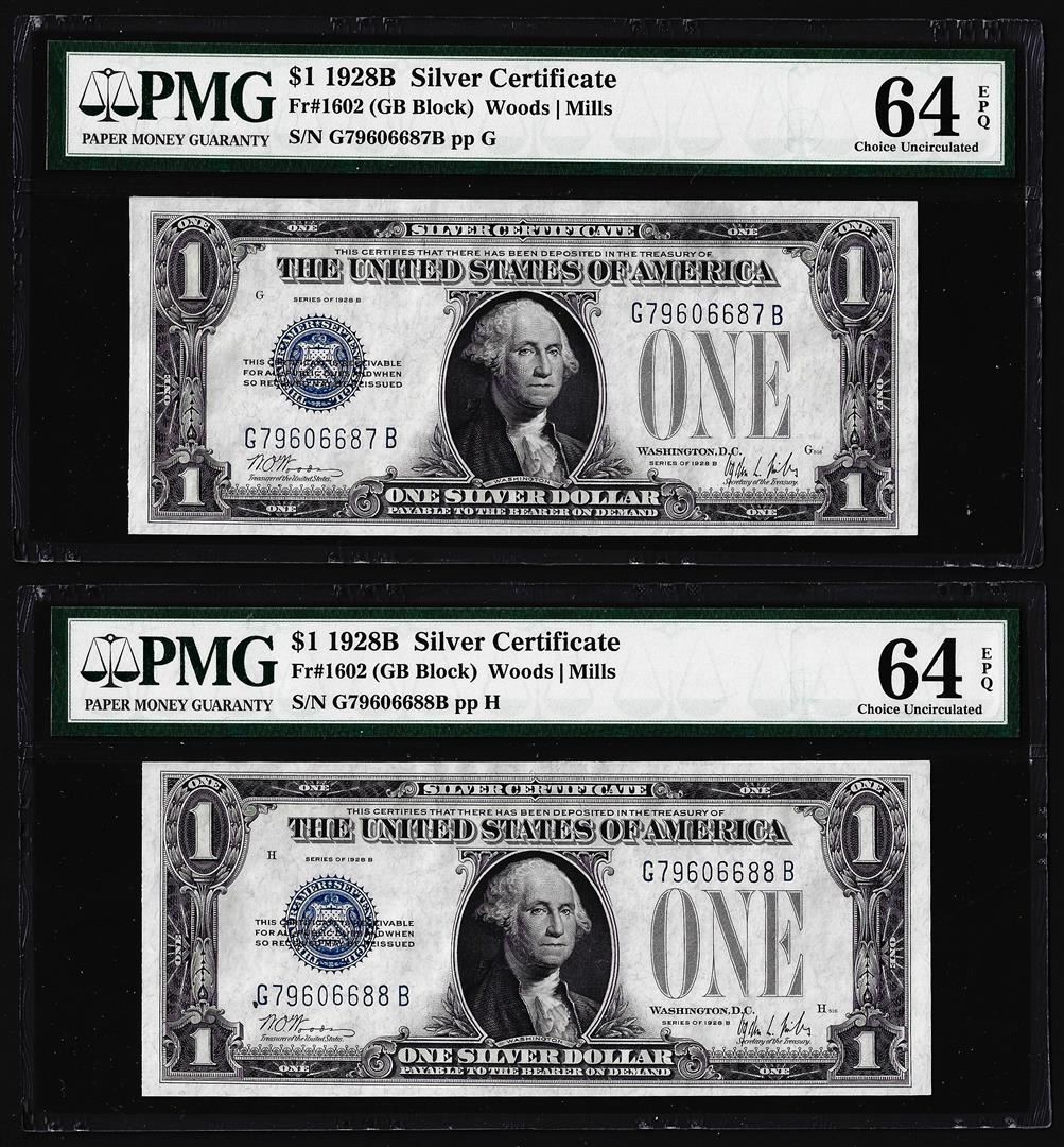 One (2) Consecutive 1928B $1 Silver Certificate Notes Fr.1602 PMG Choice Uncirculated 64EPQ. PMG Certified.