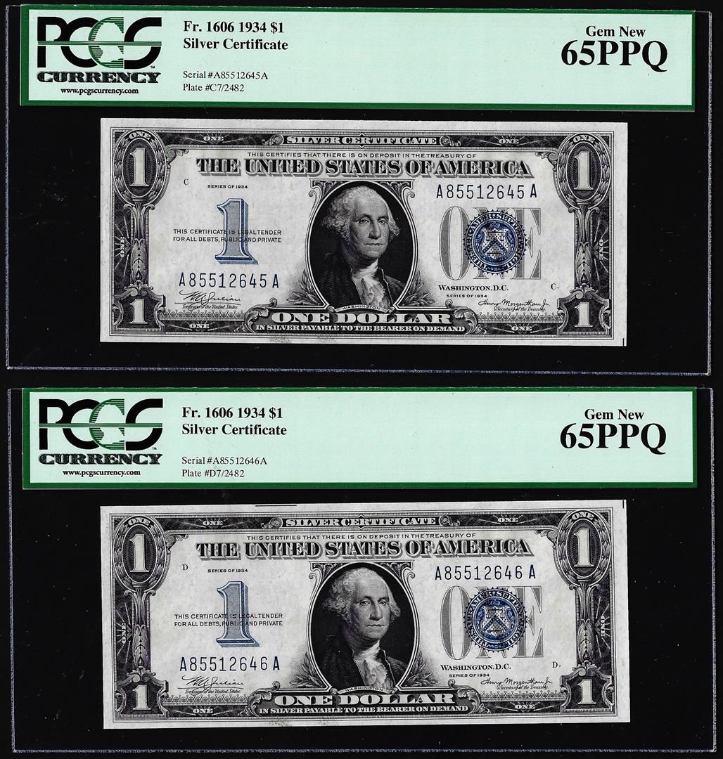 One (2) Consecutive 1934 $1 Funnyback Silver Certificate Notes FR.1606 PCGS Gem New 65PPQ. PCGS Graded.