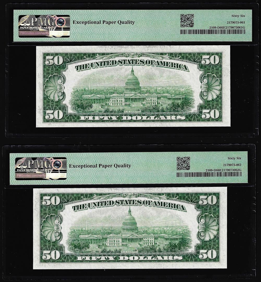 One (2) Consecutive 1950B $50 Federal Reserve Notes Fr.2109-D PMG Gem Uncirculated 66EPQ. PMG Certified.