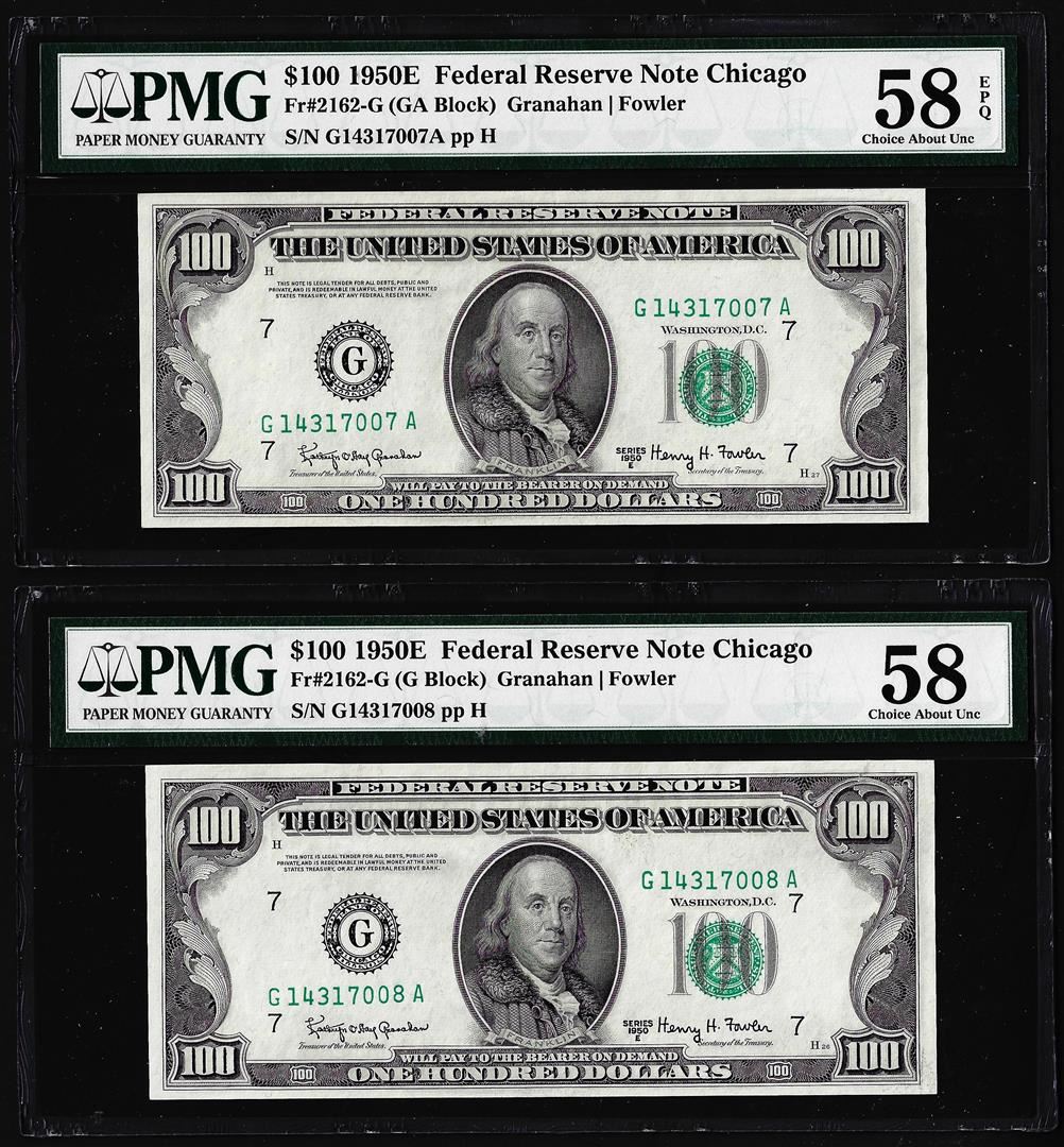 One (2) Consecutive 1950E $100 Federal Reserve Notes Chicago PMG Choice About Unc 58EPQ. PMG Certified.