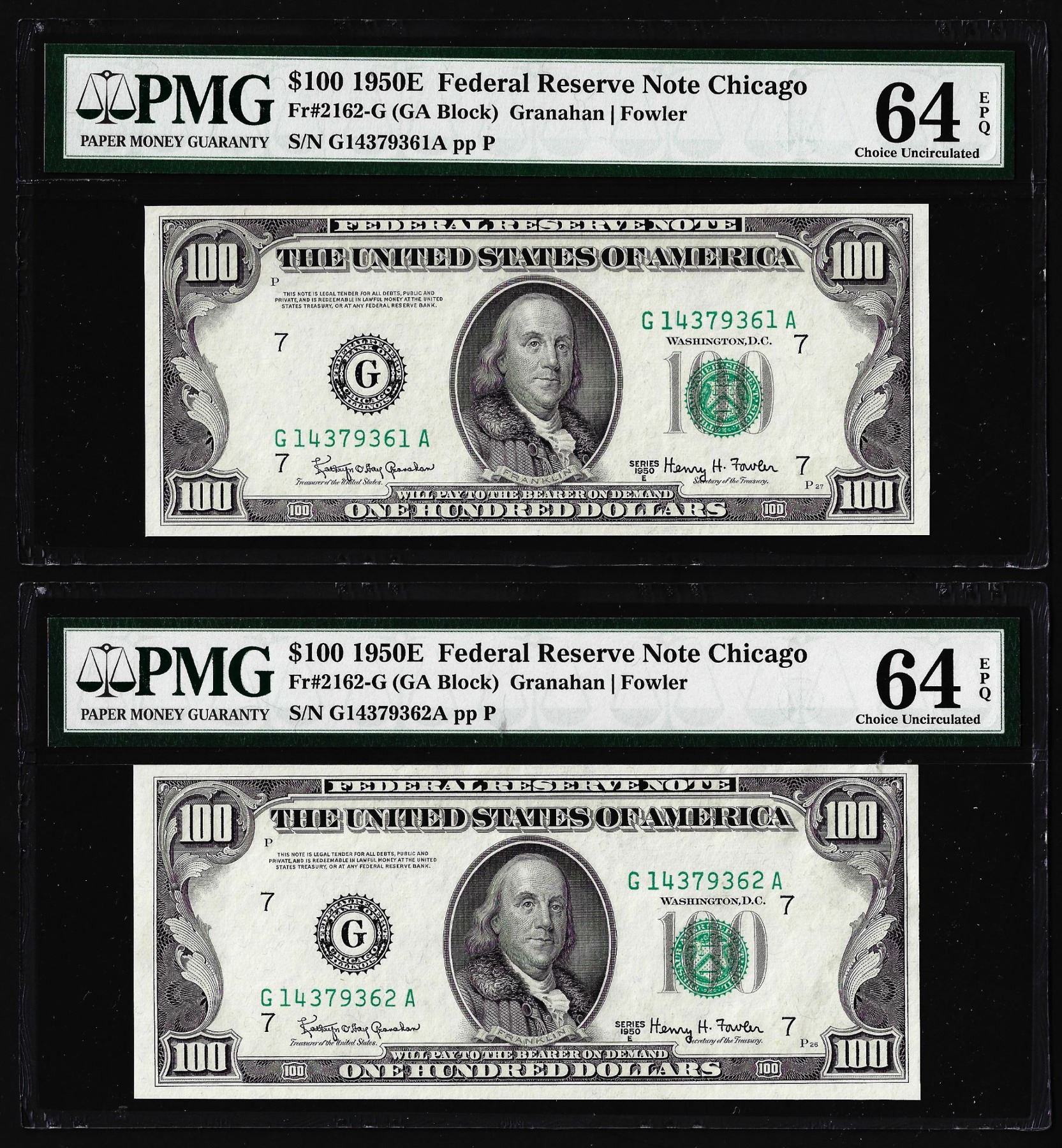 (2) Consecutive 1950E $100 Federal Reserve Notes Chicago PMG Choice Uncirculated 64EPQ