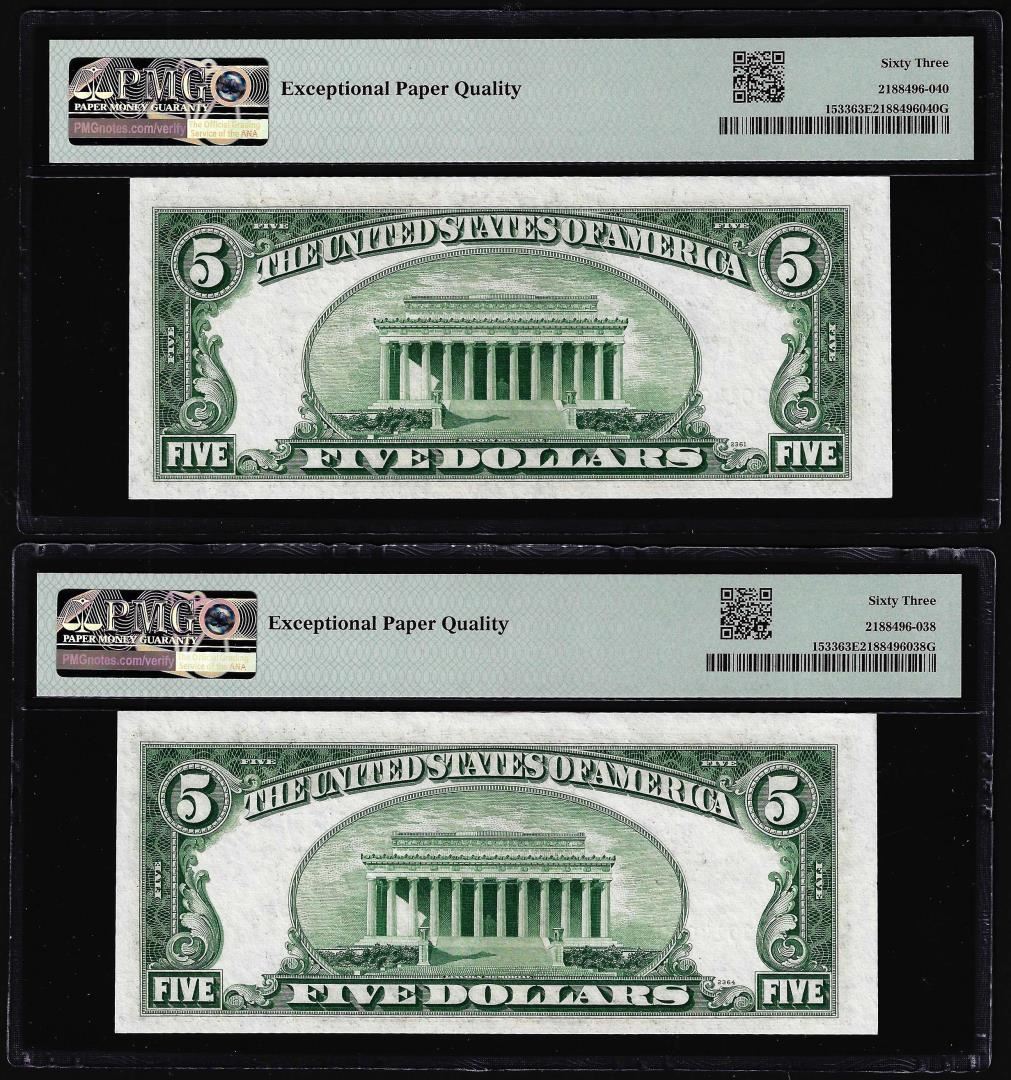 One (2) Consecutive 1953A $5 Legal Tender Notes Fr.1533 PMG Choice Uncirculated 63EPQ. PMG Certified.