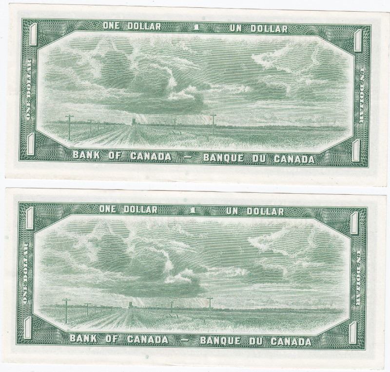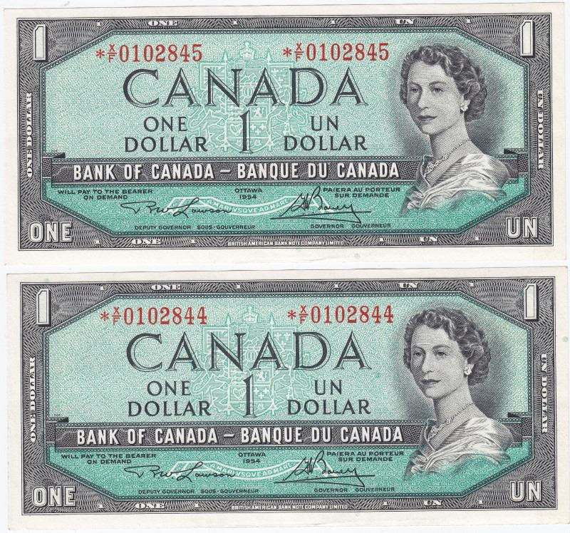 2 Consecutive 1954 Bank Of Canada $1 Bank Notes - Modified Portrait - Lawson/Bouey - AU/UNC - BC-37dA - Trends Value $100