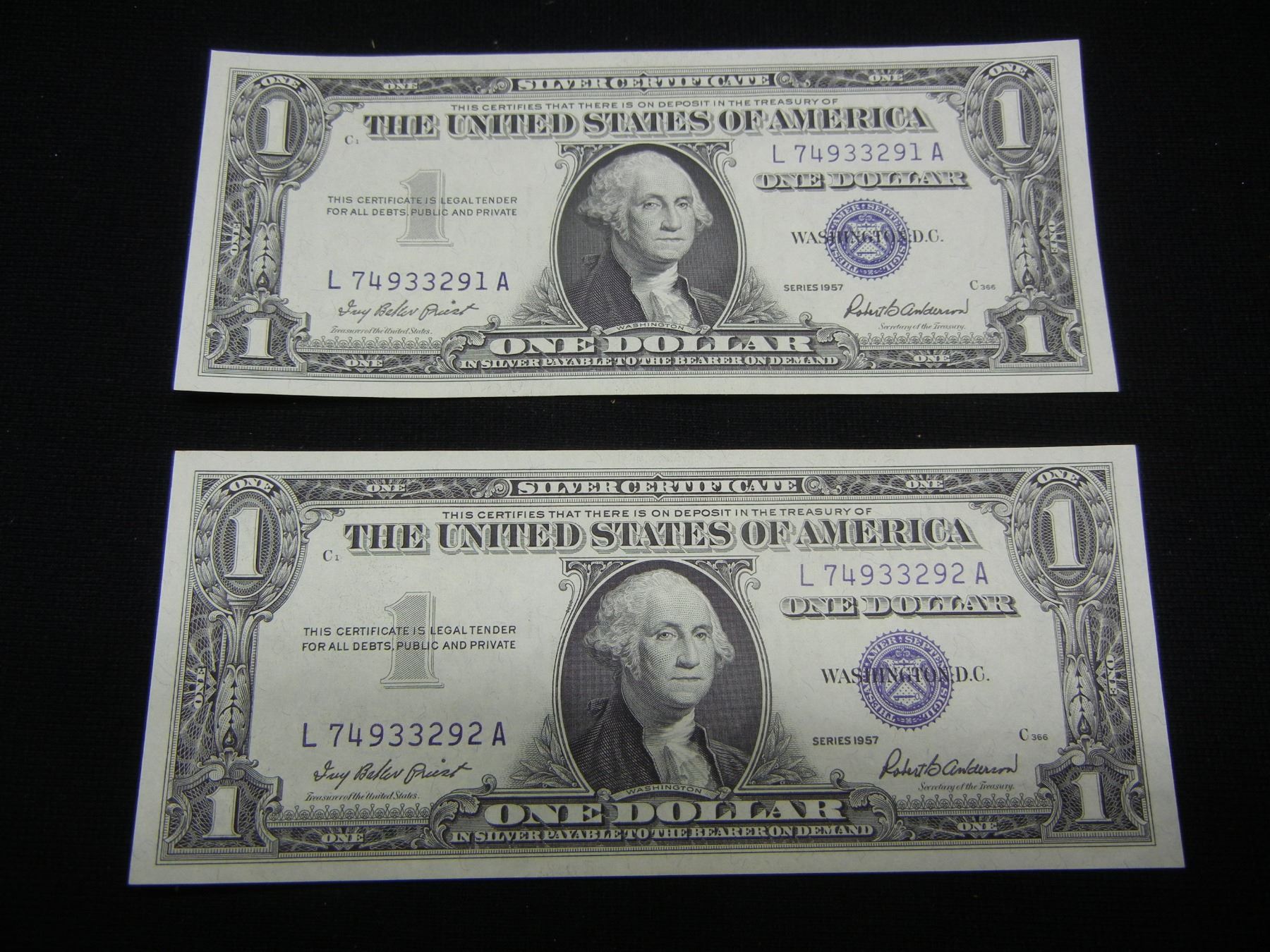 2 Consecutive 1957 Crisp Unc Silver Certificates
