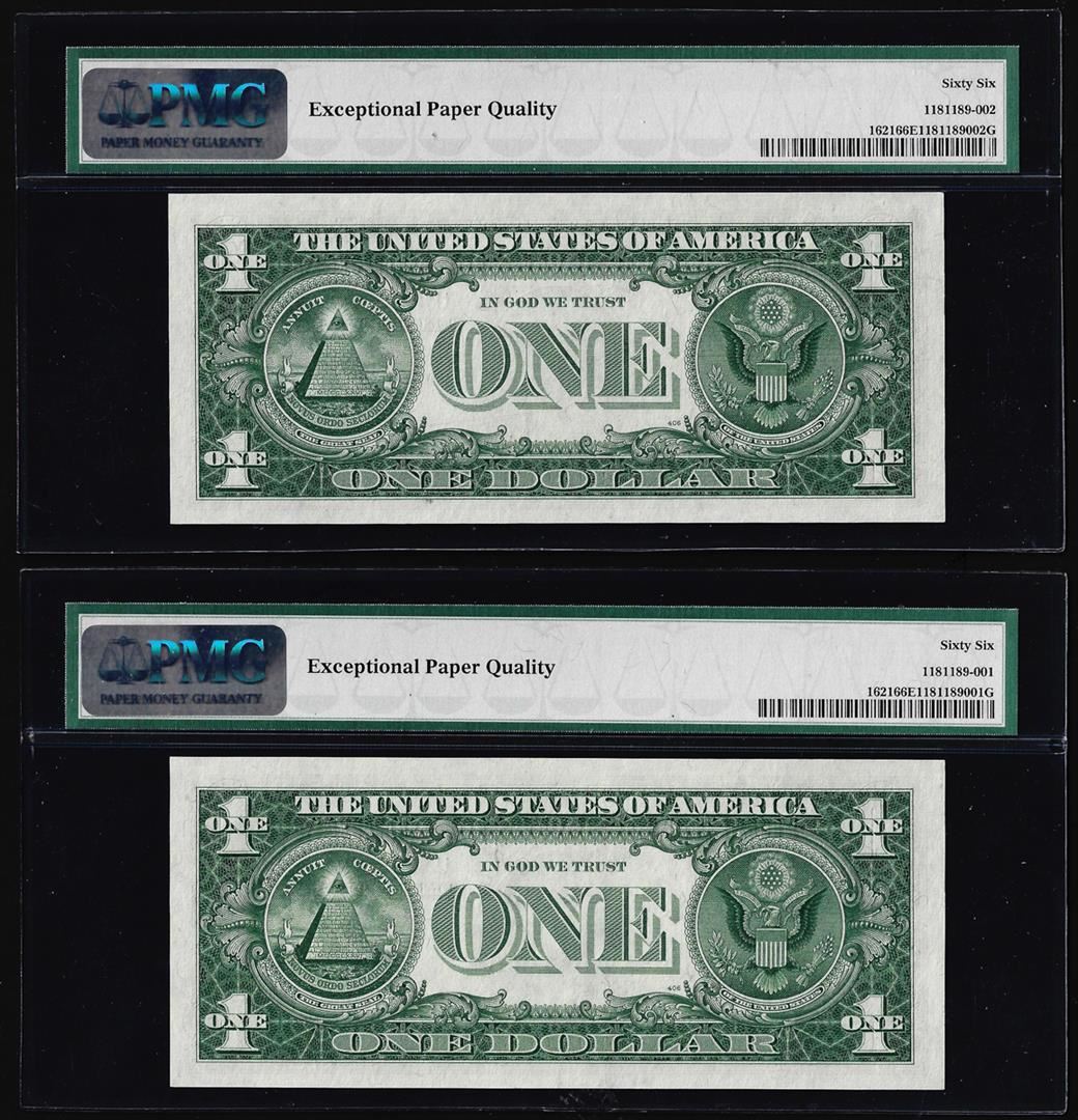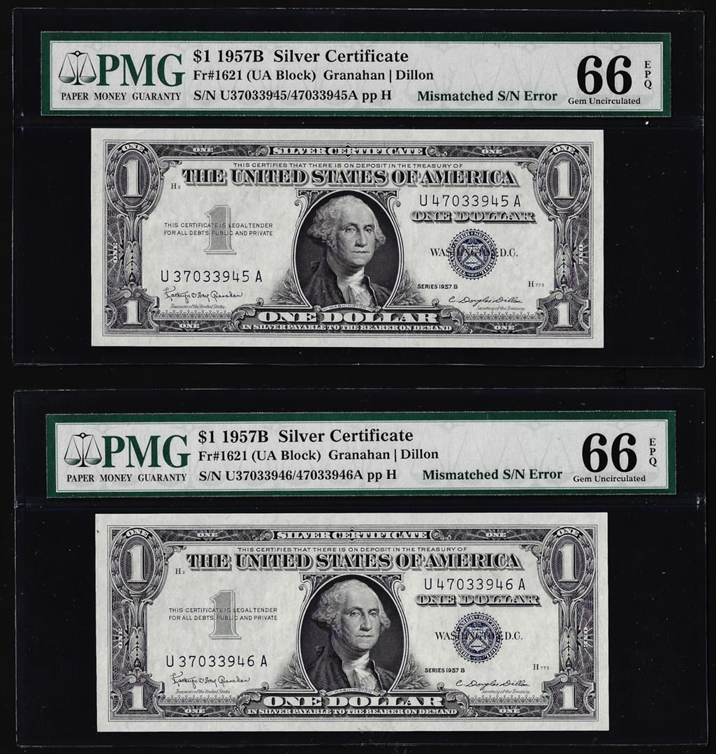 One (2) Consecutive 1957B $1 Silver Certificate Notes Mismatch Serial Numbers PMG Gem Unc. 66EPQ. PMG Certified.