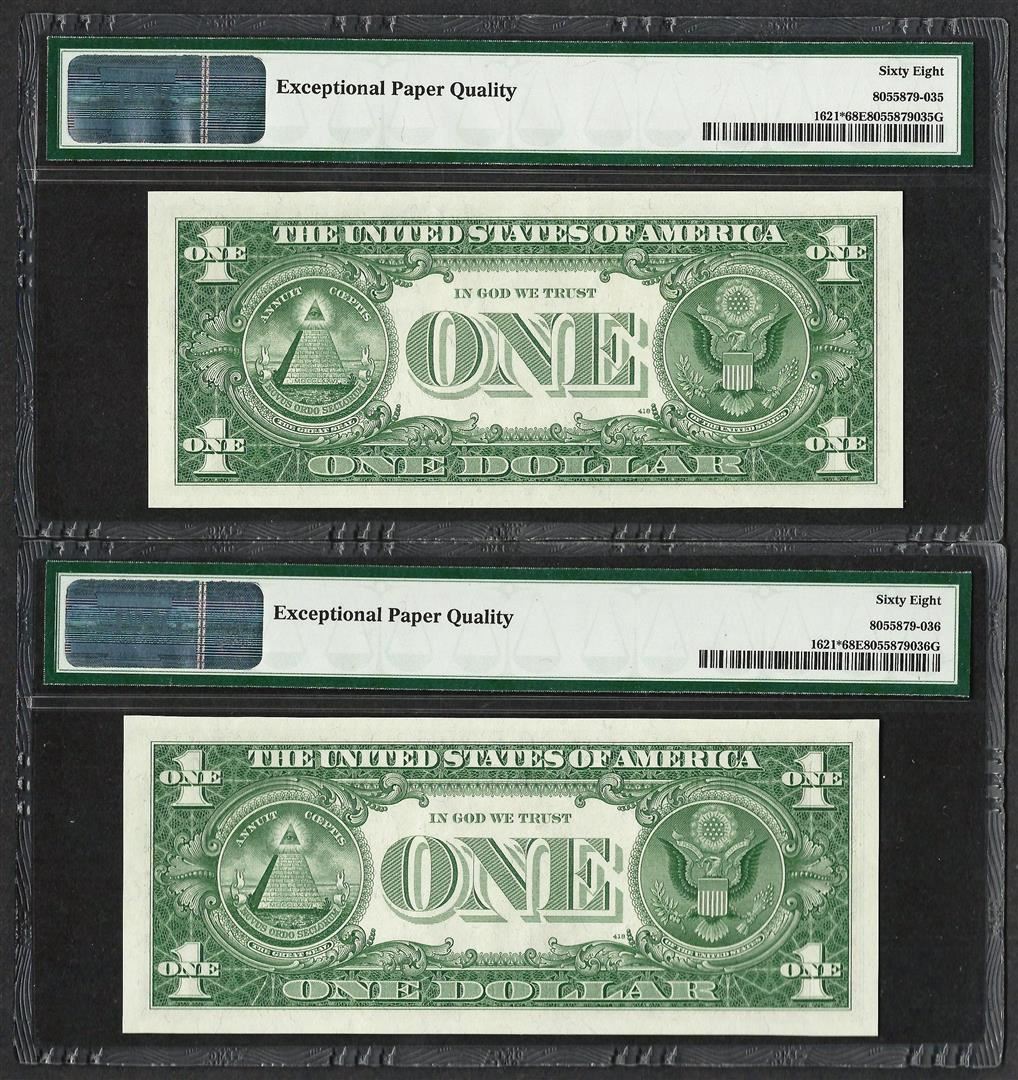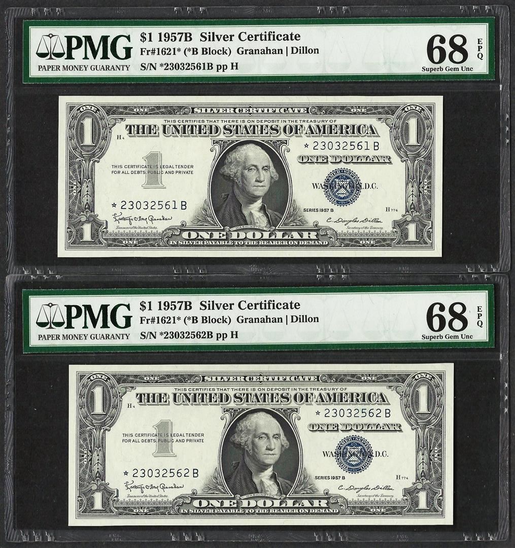 One (2) Consecutive 1957B $1 Silver Certificate STAR Notes PMG Superb Gem Unc. 68PPQ. PMG Certified.