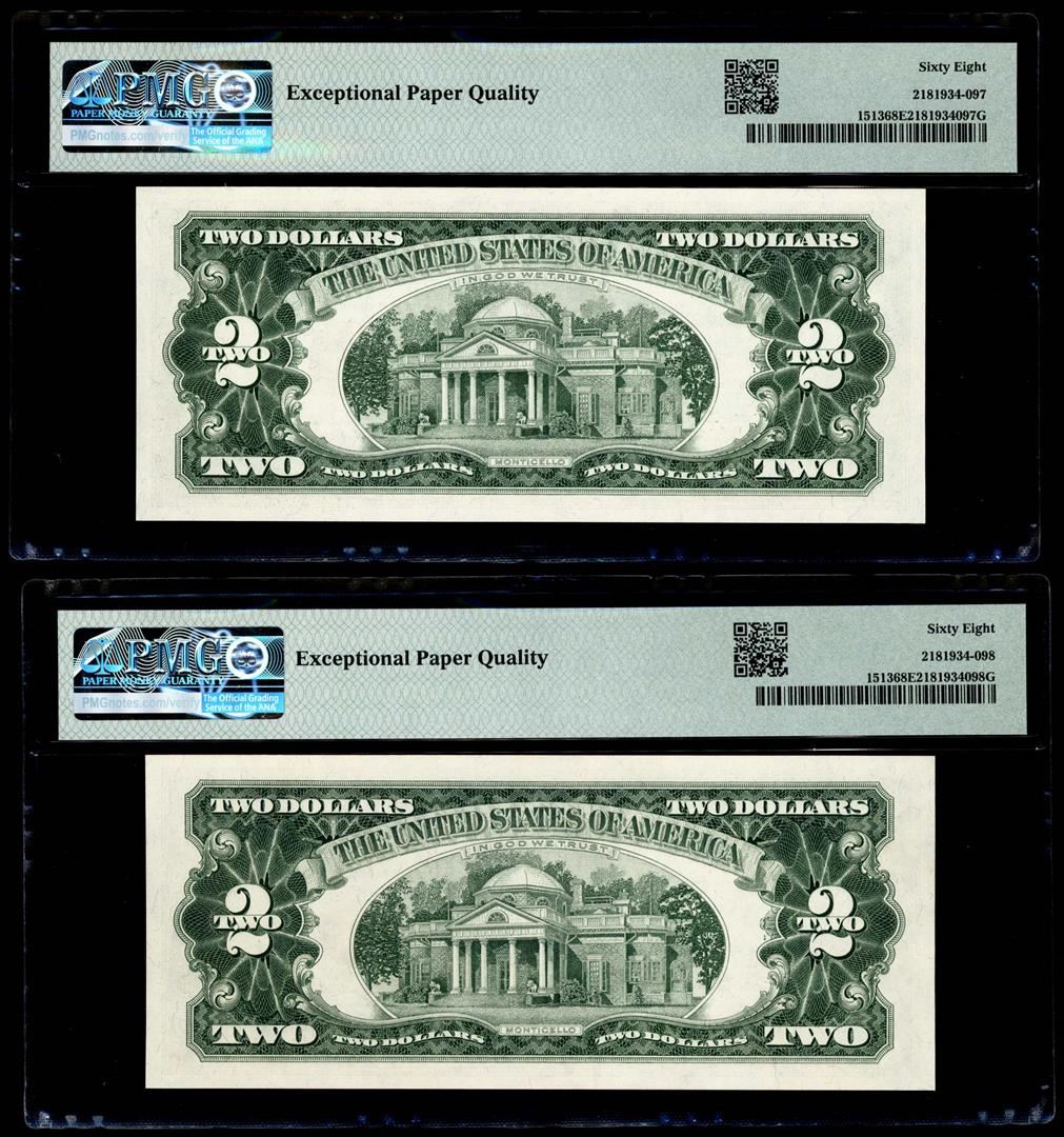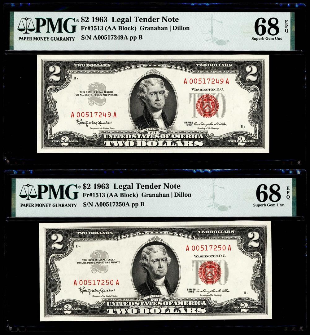 Lot of (2) Consecutive 1963 $2 Legal Tender Notes Fr.1513 PMG Superb Gem Uncirculated 68EPQ. PMG Certified.