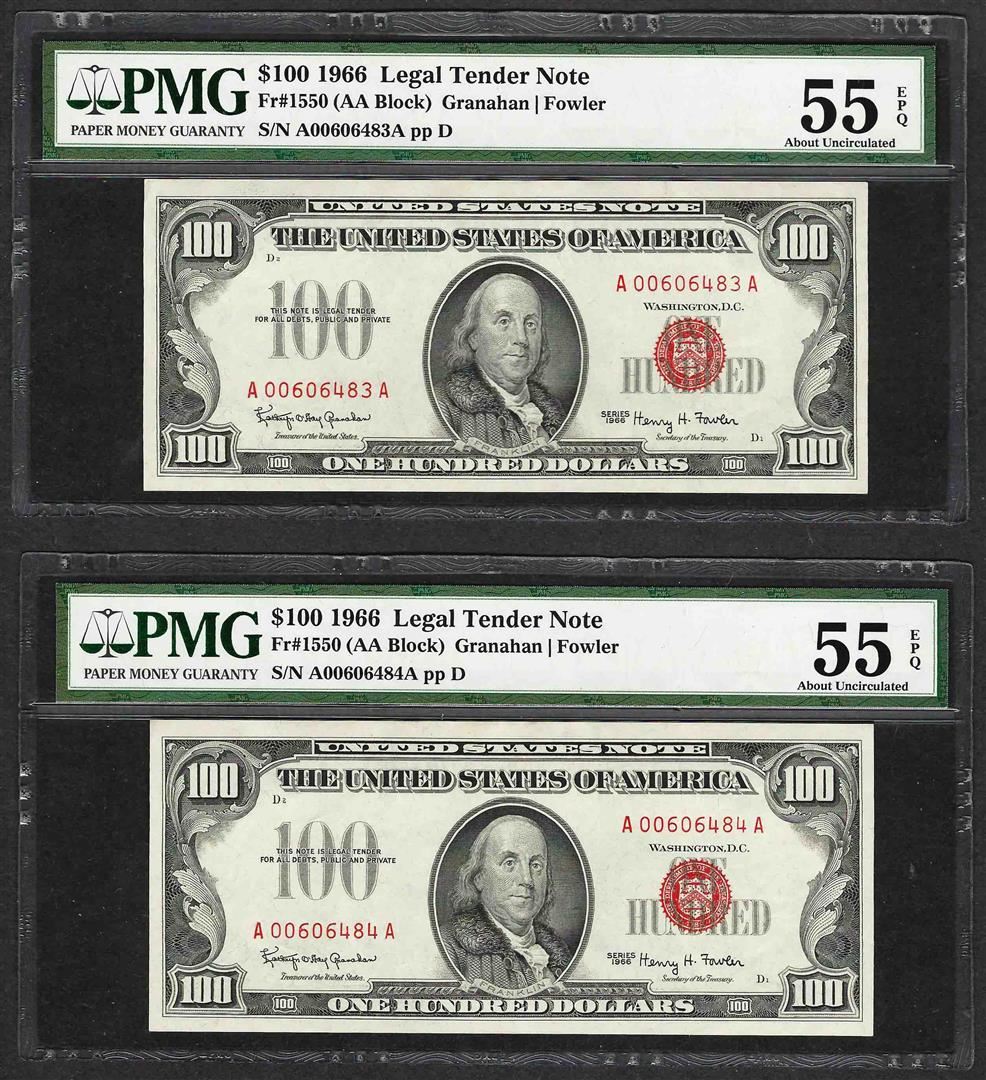 (2) Consecutive 1966 $100 Legal Tender Notes PMG Choice About Uncirculated 55EPQ