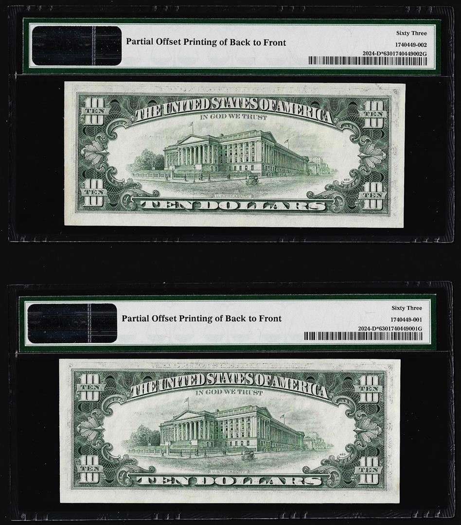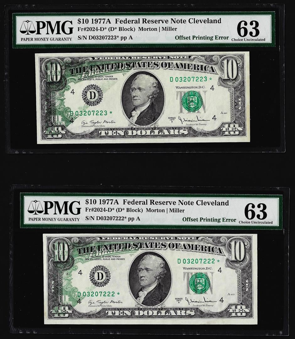 One (2) Consecutive 1977A $10 Federal Reserve Offset ERROR STAR Notes PMG Choice Unc. 63. PMG Certified.
