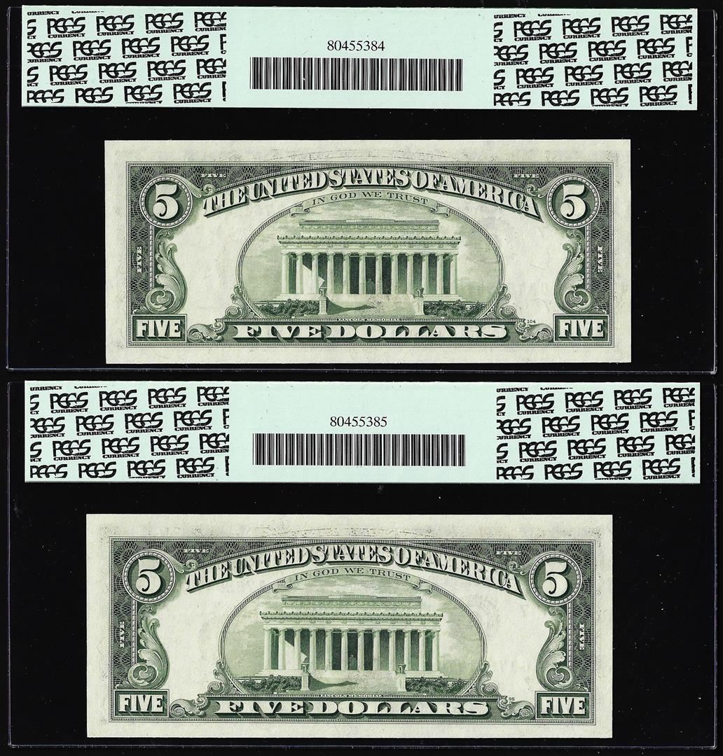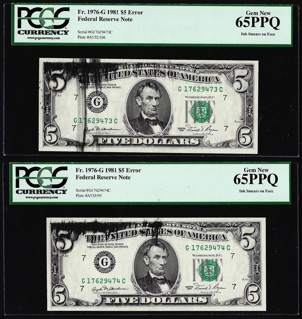 (2) Consecutive 1981 $5 Federal Reserve Ink Smears Error Notes PCGS Gem New 65PPQ