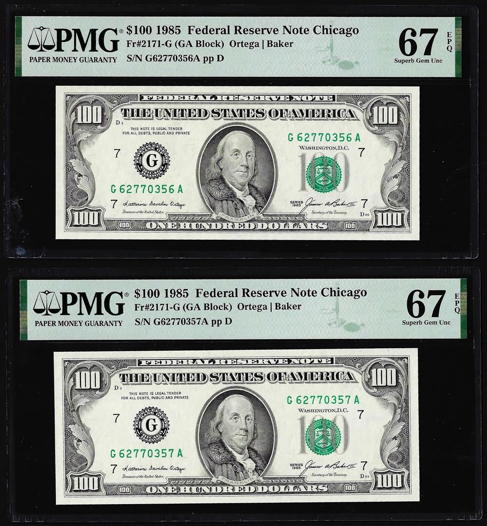 One (2) Consecutive 1985 $100 Federal Reserve Notes Fr.2171-G PMG Superb Gem Unc 67EPQ. PMG Certified.