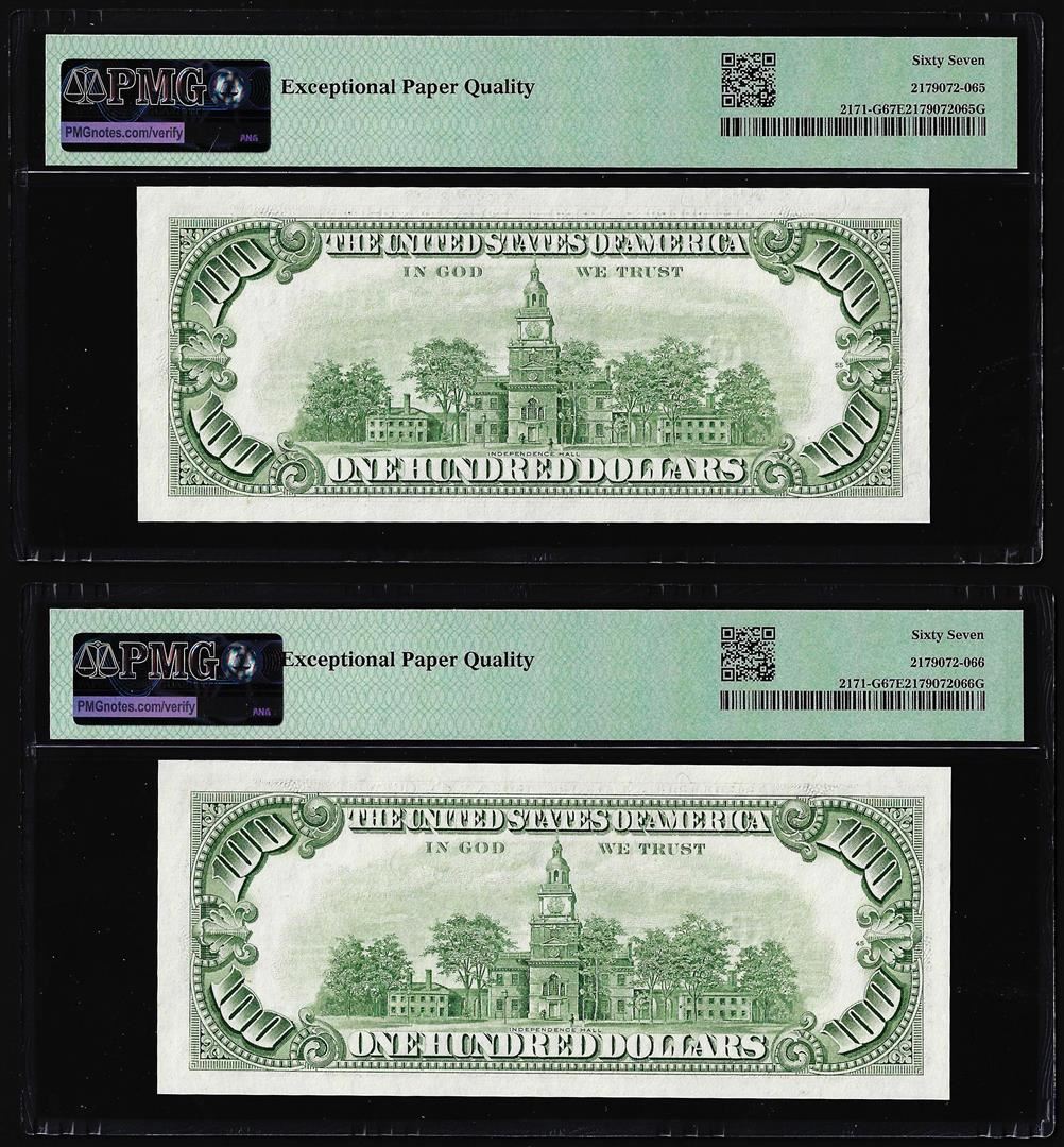 (2) Consecutive 1985 $100 Federal Reserve Notes Fr.2171-G PMG Superb Gem Unc 67EPQ