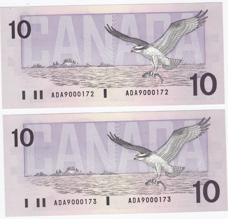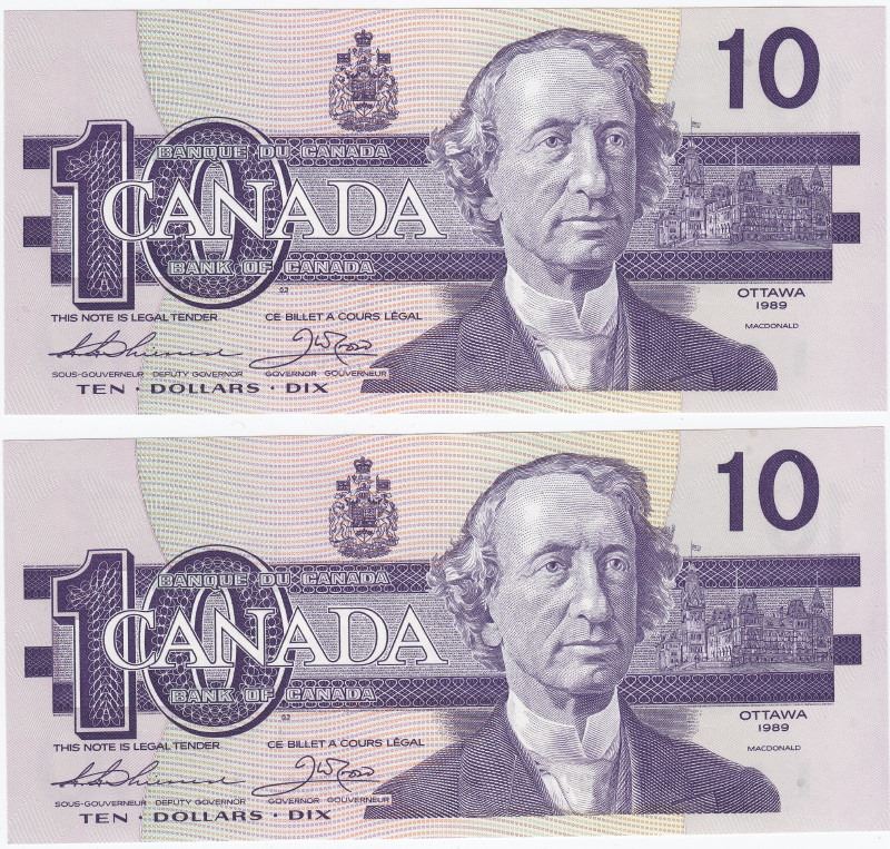 2 Consecutive 1989 Bank Of Canada $10 Bank Notes - 1st Series (ADA) - Choice UNC