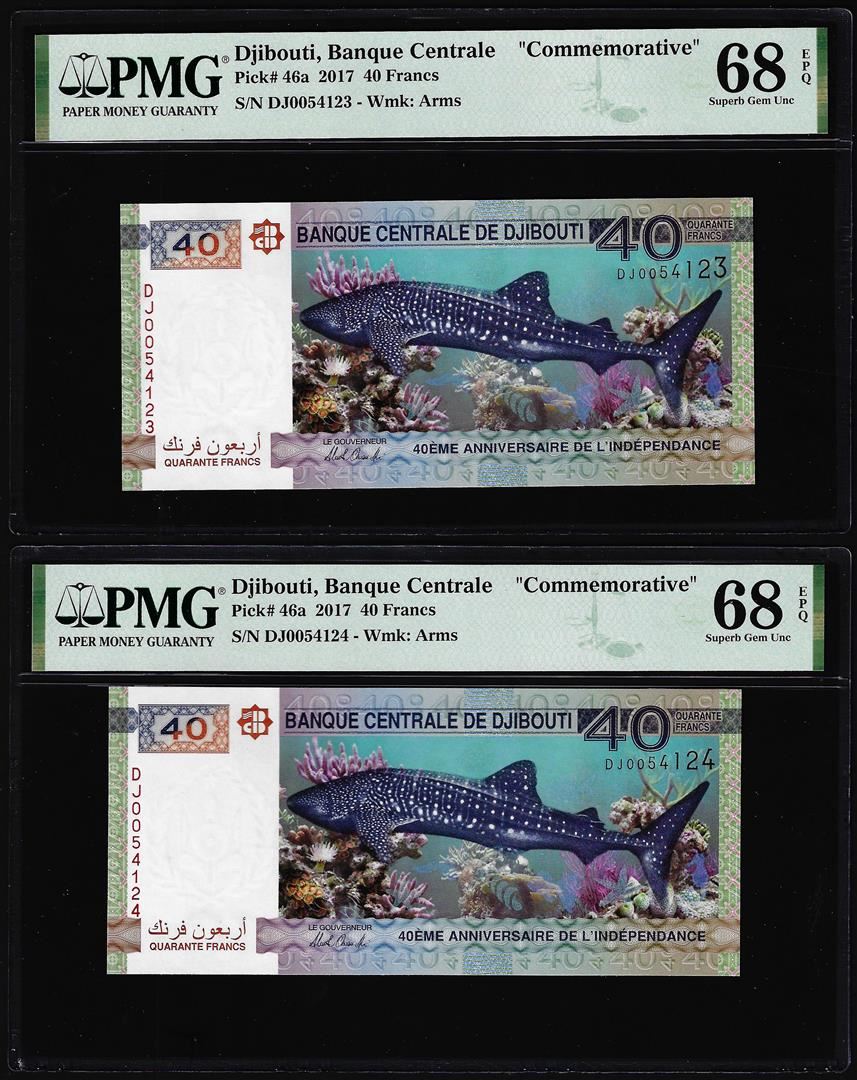 One (2) Consecutive 2017 Djibouti 40 Francs Bank Notes PMG Superb Gem Uncirculated 68EPQ. PMG Certified.