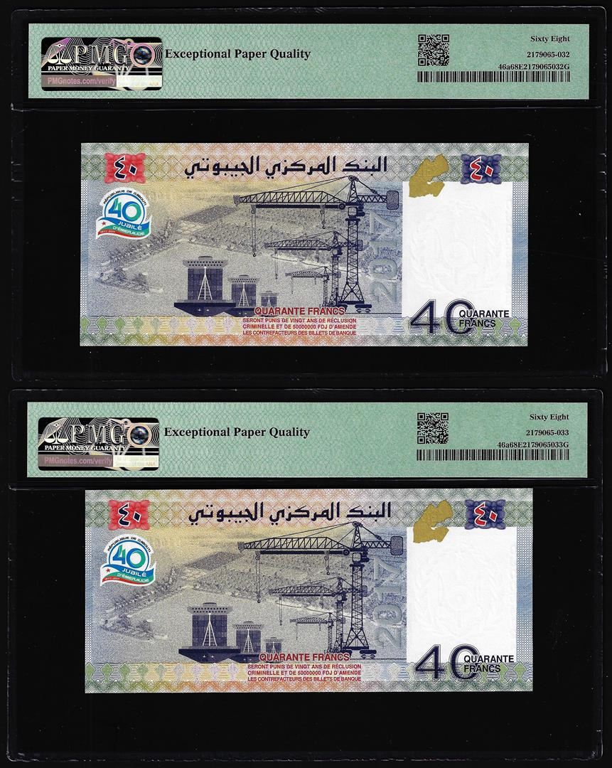 (2) Consecutive 2017 Djibouti 40 Francs Bank Notes PMG Superb Gem Uncirculated 68EPQ