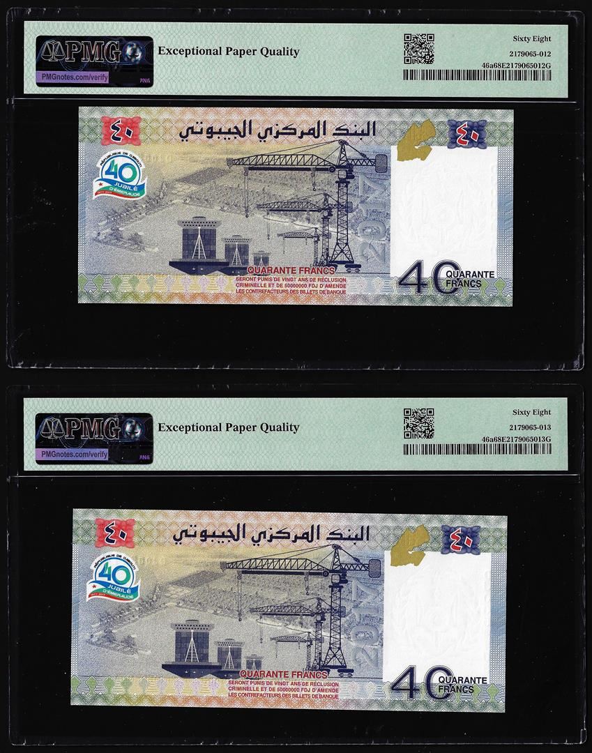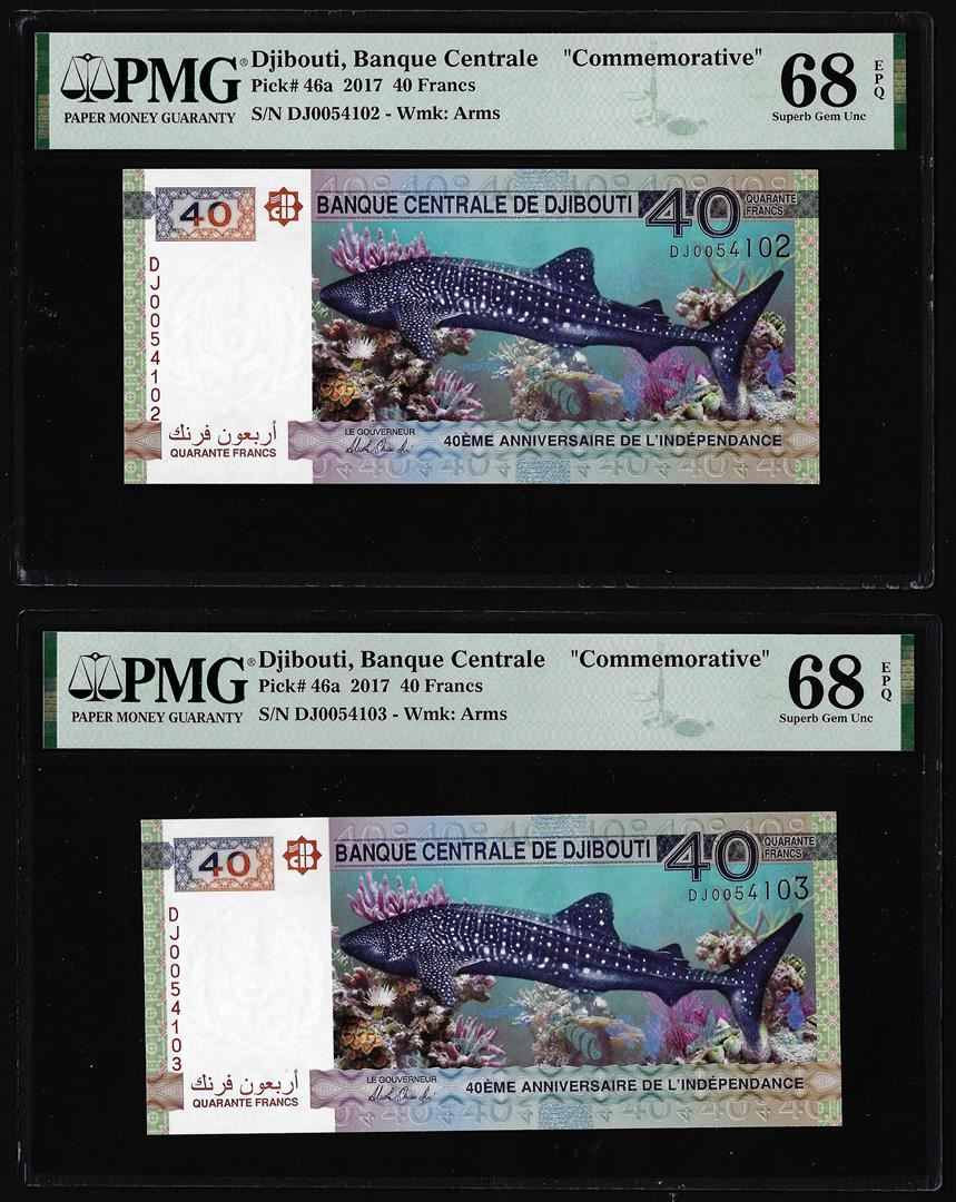 One (2) Consecutive 2017 Djibouti 40 Francs Bank Notes PMG Superb Gem Uncirculated 68EPQ. PMG Certified.