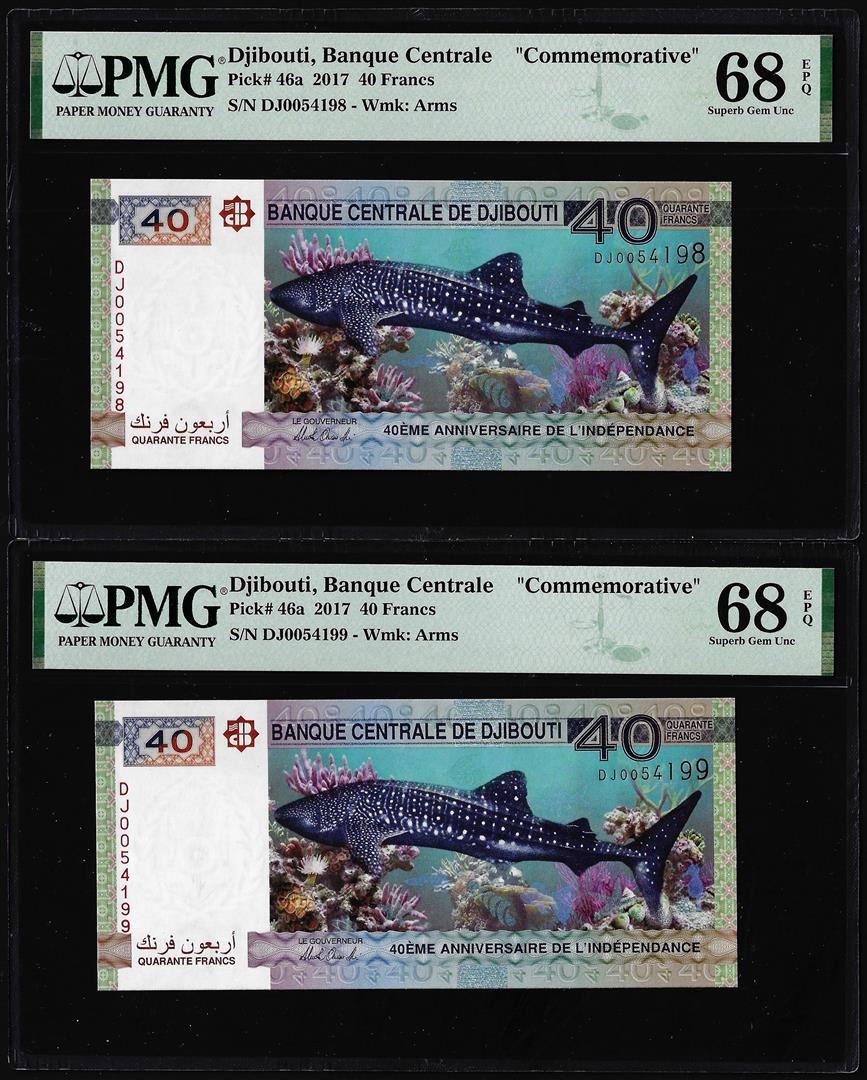 One (2) Consecutive 2017 Djibouti 40 Francs Bank Notes PMG Superb Gem Uncirculated 68EPQ. PMG Certified.