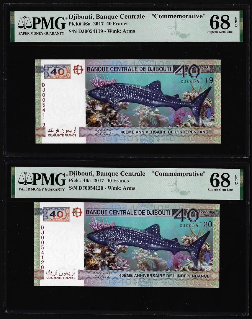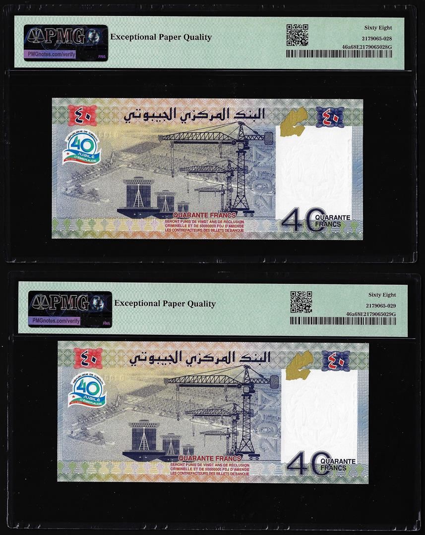 One (2) Consecutive 2017 Djibouti 40 Francs Bank Notes PMG Superb Gem Uncirculated 68EPQ. PMG Certified.