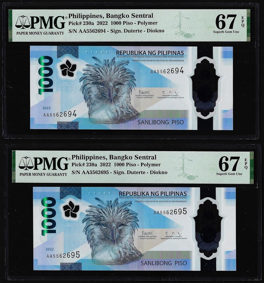 (2) Consecutive 2022 Philippines 1000 Piso Notes PMG Superb Gem Uncirculated 67EPQ