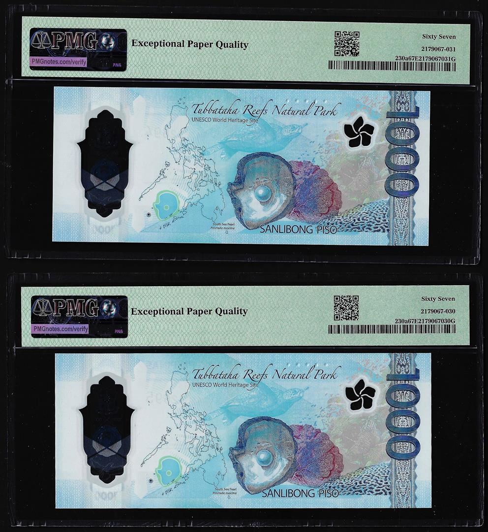 One (2) Consecutive 2022 Philippines 1000 Piso Notes PMG Superb Gem Uncirculated 67EPQ. PMG Certified.