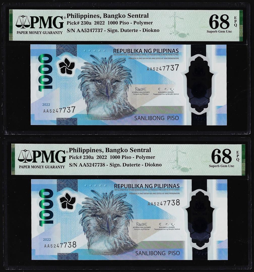 One (2) Consecutive 2022 Philippines 1000 Piso Notes PMG Superb Gem Uncirculated 68EPQ. PMG Certified.