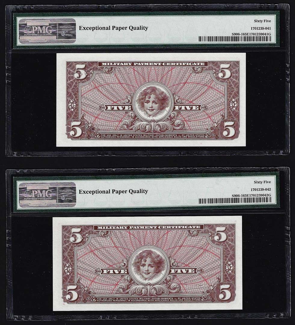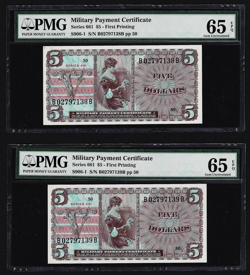 One (2) Consecutive $5 Military Payment Certificates Series 661 PMG Gem Unc 65EPQ. PMG Certified.