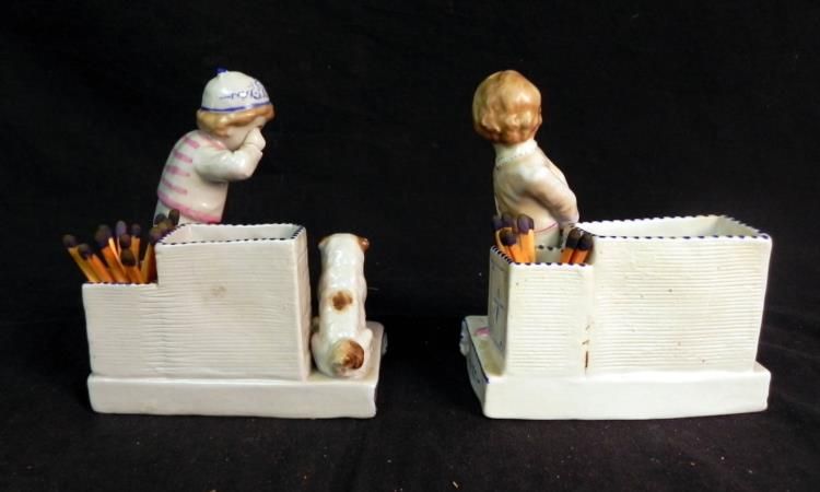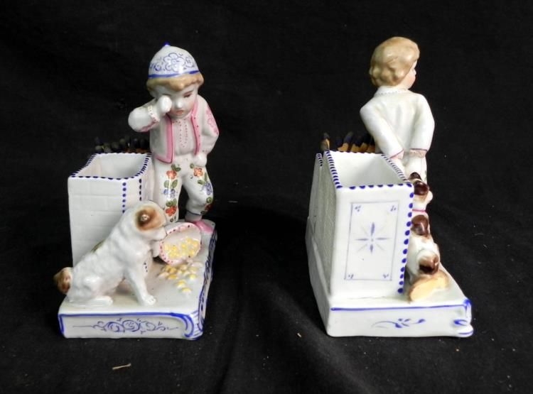 Available are 2 Conta & Boehme Porcelain Match Strikers/Holders. They come with original matches, and both are in excellent condition. The bottom of the boy reads "4105" and "254" and the bottom of the girl reads "4148" and "93". They stand about 4.5" tall and are about 4" across.