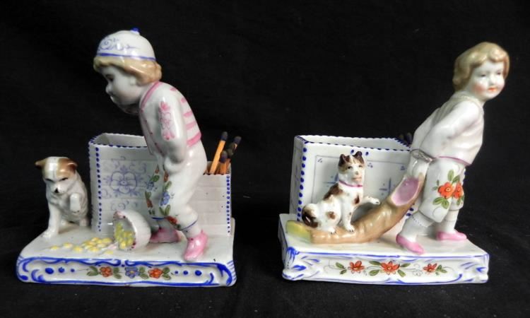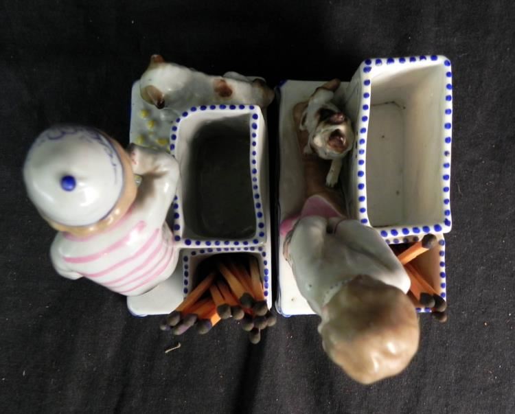 Available are 2 Conta & Boehme Porcelain Match Strikers/Holders. They come with original matches, and both are in excellent condition. The bottom of the boy reads "4105" and "254" and the bottom of the girl reads "4148" and "93". They stand about 4.5" tall and are about 4" across.