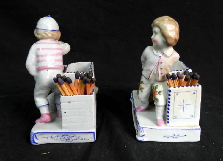 Available are 2 Conta & Boehme Porcelain Match Strikers/Holders. They come with original matches, and both are in excellent condition. The bottom of the boy reads "4105" and "254" and the bottom of the girl reads "4148" and "93". They stand about 4.5" tall and are about 4" across.