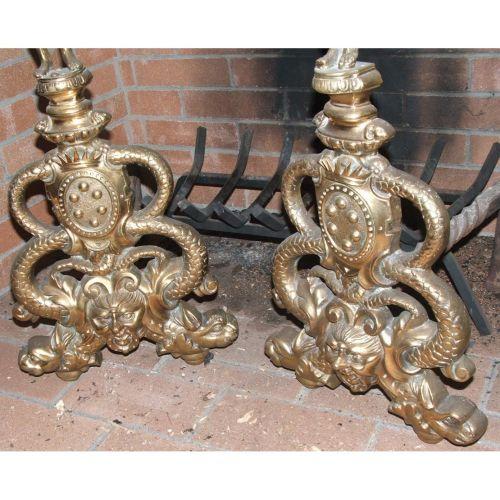 Continental Late 19th- Early 20th century. Brass. A nice pair of Renaissance style andirons with classical figures above a dolphin supported plinth. 31" high
