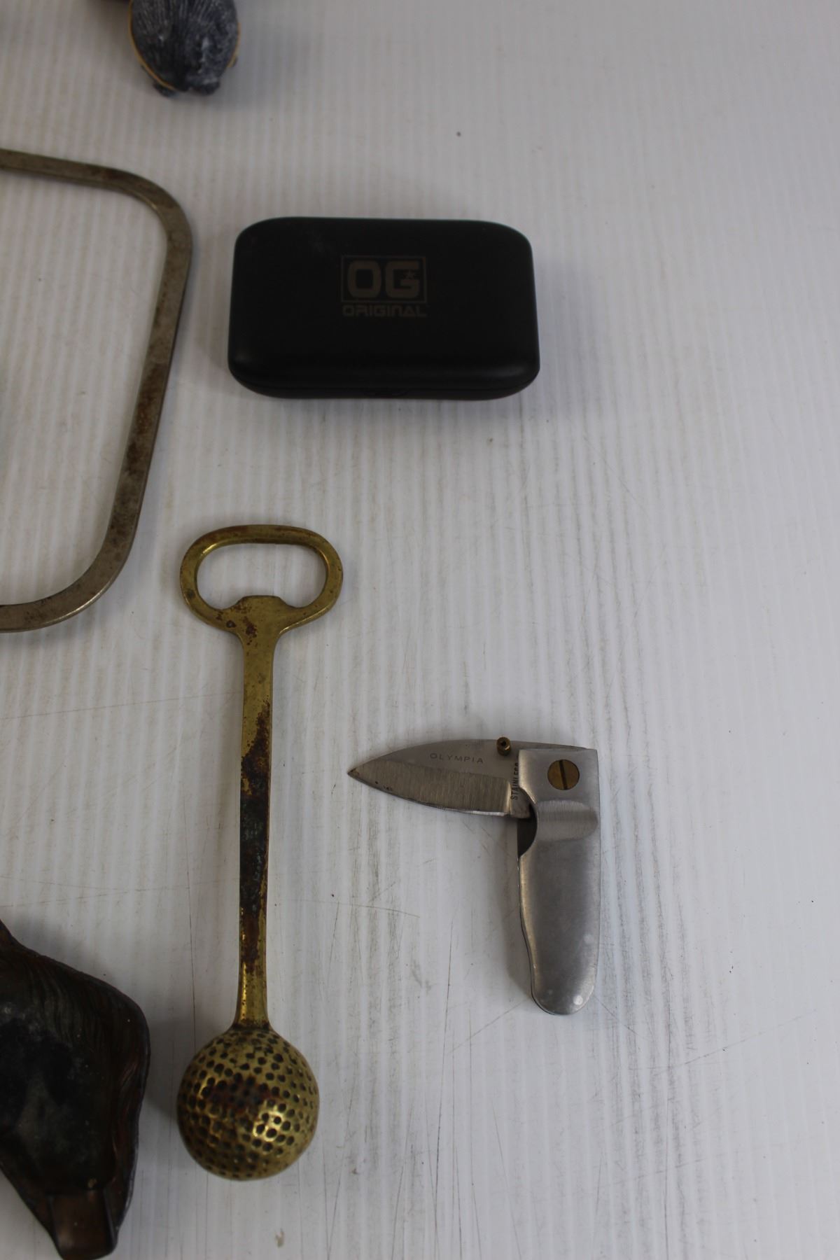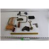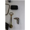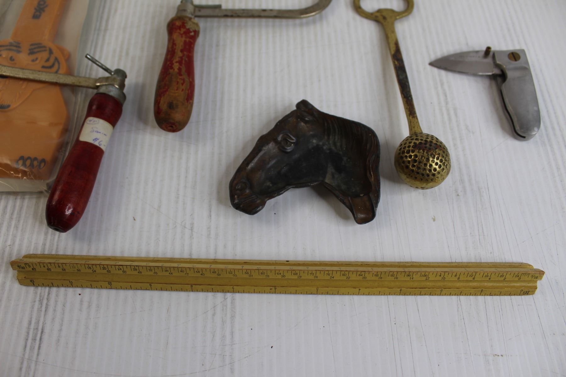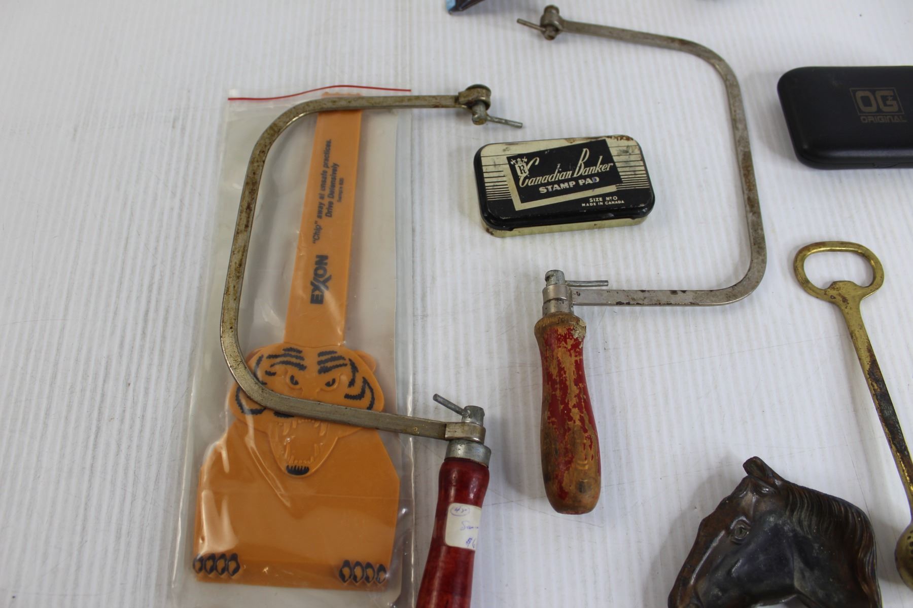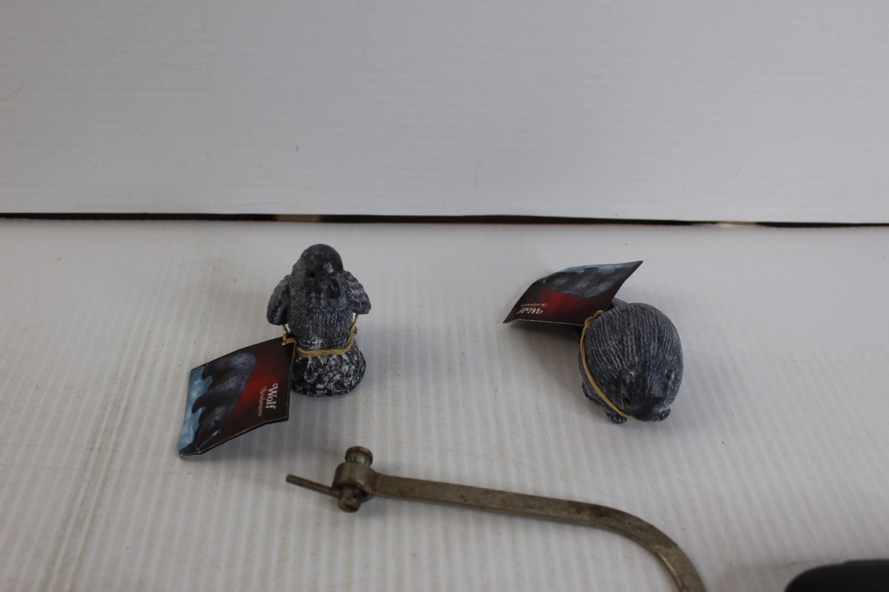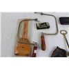 (2) Coping Saws, Pocketknife, (2) Small Wolf Sculpture Decorations, Misc.