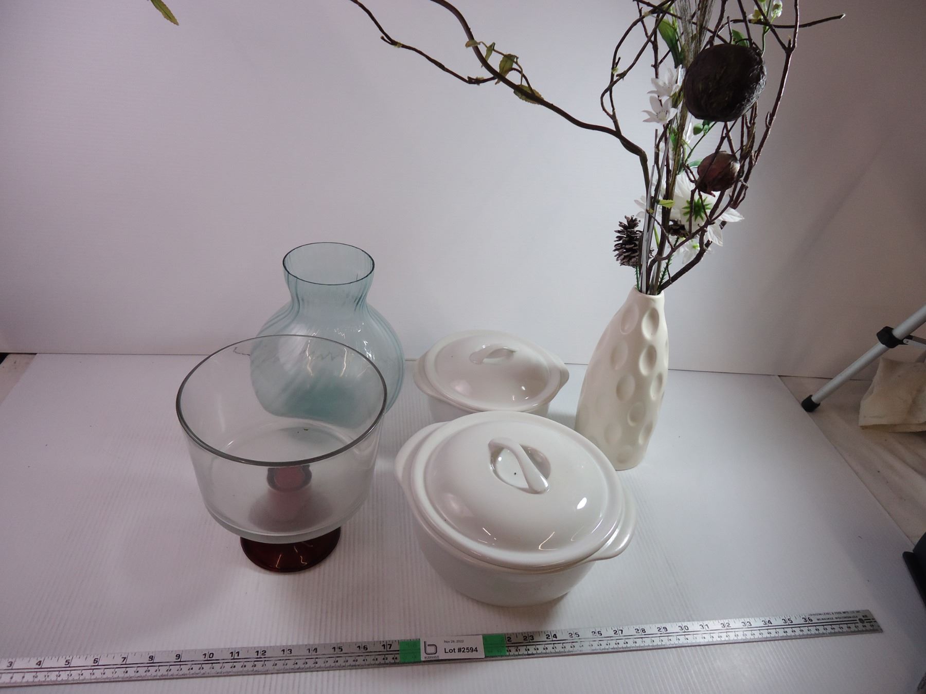 (2) Corelle Pots,(2) Vases and Cake Dish