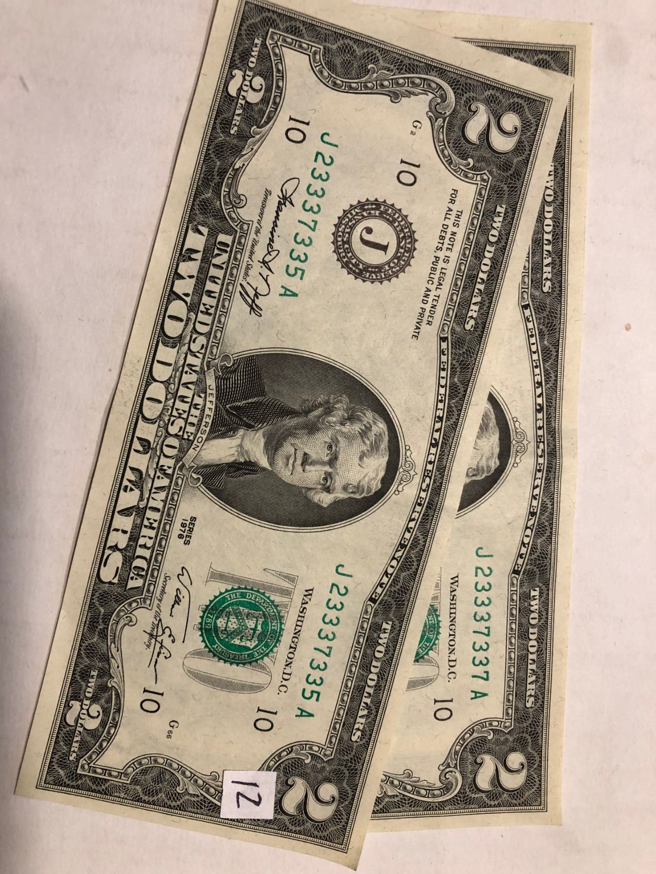 2 Crisp 1976 Almost Consecutive 2 Dollar Bills Missing Middle Note These Serial Numbers are 23337335 and 23337337