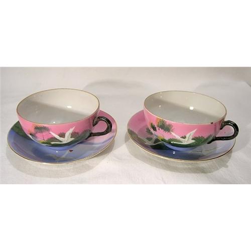 2 Cups and Plates painted by hands. Representing beautiful birds as you can see. With one chip in each plate as you can see in the pictures.