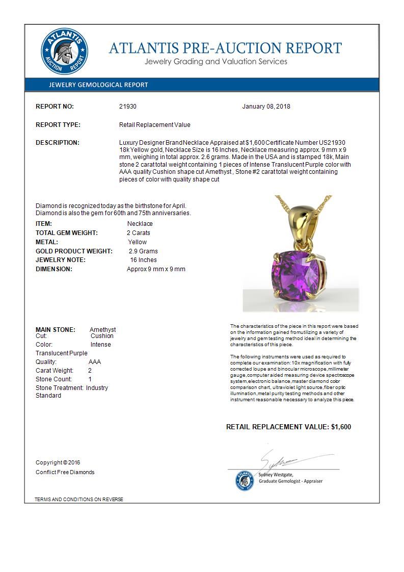 REF-24H5A -21930 ---- 2 Cushion Cut CTW Amethyst Designer Solitaire Necklace 18K Yellow Gold ---- Luxury Designer Brand Necklace Appraised at $1,600 Certificate Number US21930 18k Yellow gold, Necklace Size is 16 Inches, Necklace measuring approx. 9 mm x 9 mm, weighing in total approx. 2.6 grams. Made in the USA and is stamped 18k, Main stone 2 carat total weight containing 1 pieces of Intense Translucent Purple color with AAA quality Cushion shape cut Amethyst , Stone #2 carat total weight containing pieces of color with quality shape cut