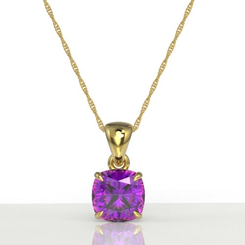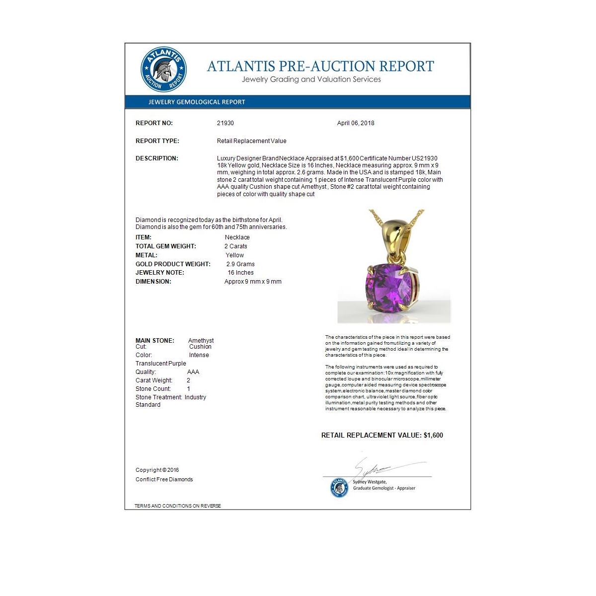 REF-24H5A -21930 ---- 2 Cushion Cut CTW Amethyst Designer Solitaire Necklace 18K Yellow Gold ---- Luxury Designer Brand Necklace Appraised at $1,600 Certificate Number US21930 18k Yellow gold, Necklace Size is 16 Inches, Necklace measuring approx. 9 mm x 9 mm, weighing in total approx. 2.6 grams. Made in the USA and is stamped 18k, Main stone 2 carat total weight containing 1 pieces of Intense Translucent Purple color with AAA quality Cushion shape cut Amethyst , Stone #2 carat total weight containing pieces of color with quality shape cut