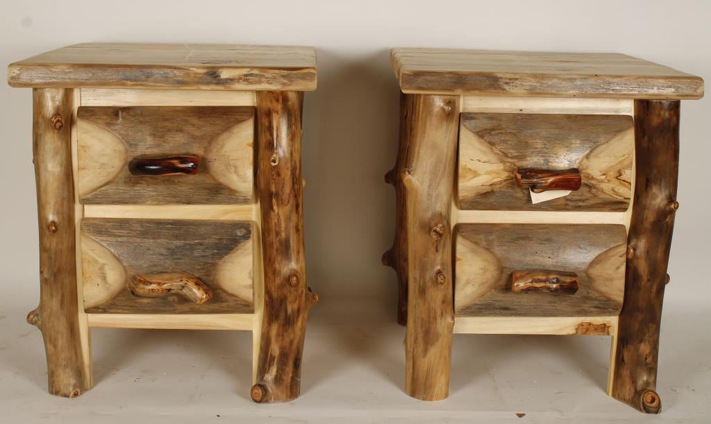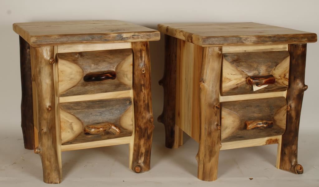Both have natural finish and two pull out drawers. Measures 27 1/2"x23"x23".