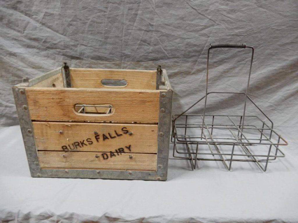 2 DAIRY BOTTLE QUART CARRIERS BURKS FALLS DAIRY WOODEN CRATE - 6 BOTTLE RACK LOCATION: UPPER LEFT