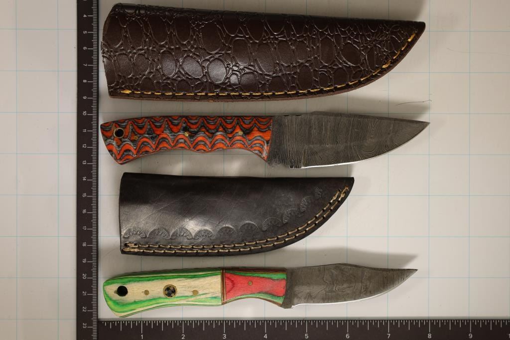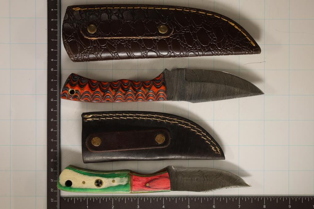 WITH LEATHER SHEATHS BOTH BROWN. 1ST KNIFE IS 7.5" AND THE OTHER IS 7.75"