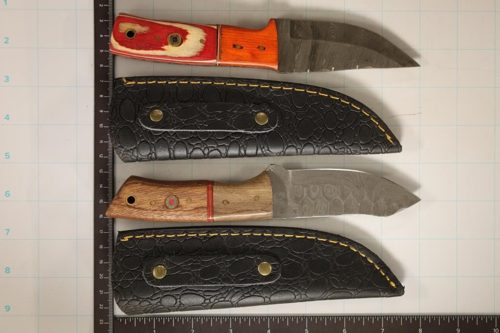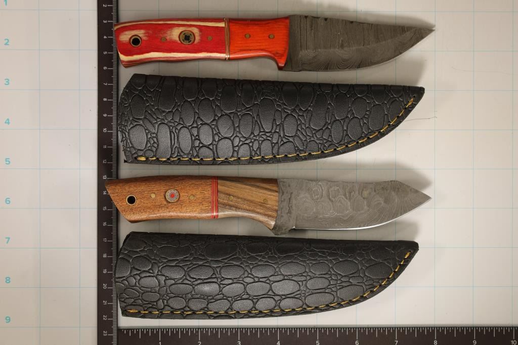 WITH LEATHER SHEATHS BOTH BLACK. 1ST KNIFE IS 8" AND THE OTHER IS 8" . GREAT AS GIFTS OR ALL AROUND HANDY KNIVES FOR ANY HUNTING, GENERAL PURPOSE, FISHING, CAMPING, HANDYMAN WORK ETC...