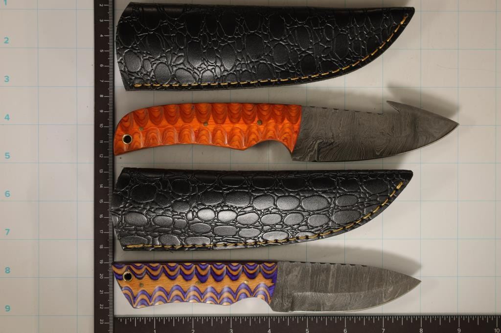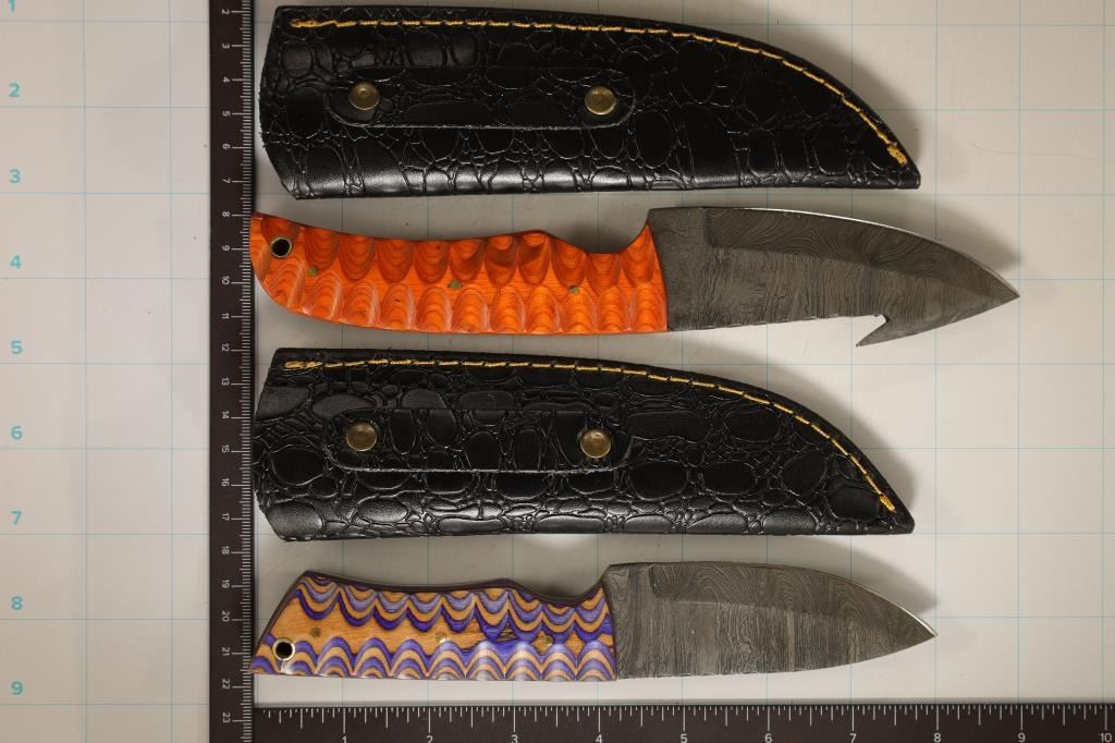 WITH LEATHER SHEATHS BOTH BLACK. 1ST KNIFE IS 8" AND THE OTHER IS 9" GUT HOOK. GREAT AS GIFTS OR ALL AROUND HANDY KNIVES FOR ANY HUNTING, GENERAL PURPOSE, FISHING, CAMPING, HANDYMAN WORK ETC...