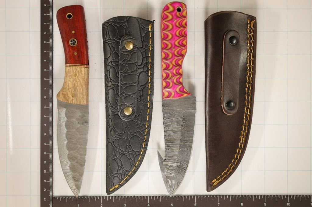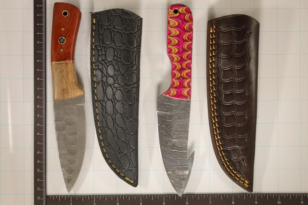 HOOK AND 8". BOTH HAVE LEATHER SHEATHS, BRAND NEW CONDITION GREAT FOR GIFTS, UPCOMING HUNTING ETC... DON'T MISS OUT ON THESE REALLY NICE PIECES!