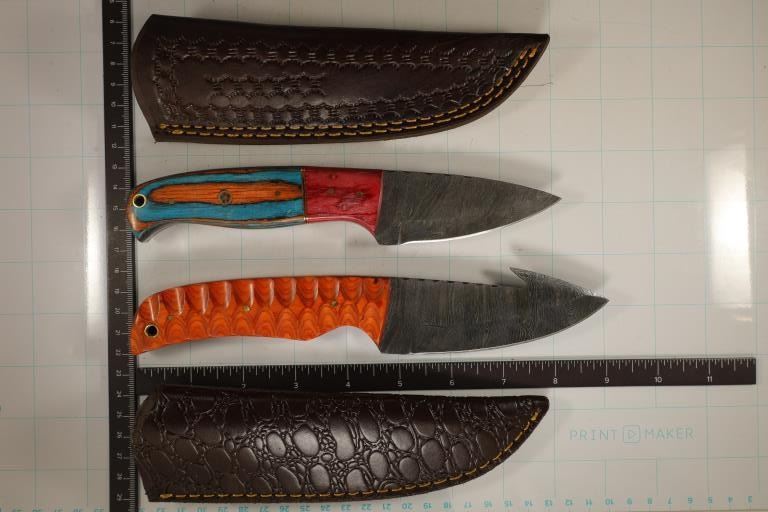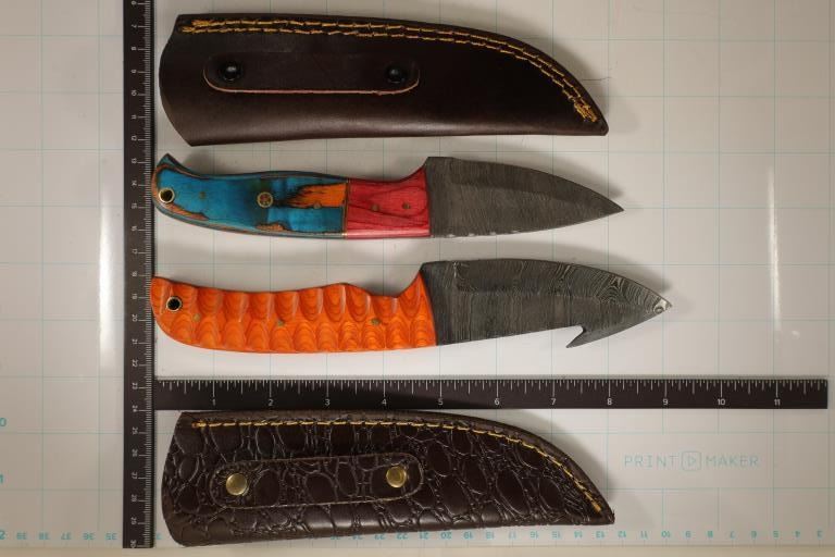 8". BOTH ARE BRAND NEW WITH LEATHER SHEATHS. NICE HARD STEEL TO KEEP YOUR EDGE LONGER. GREAT FOR GIFTS OR EXTRA KNIVES FOR THE TRUCK OR HUNTING CAMP