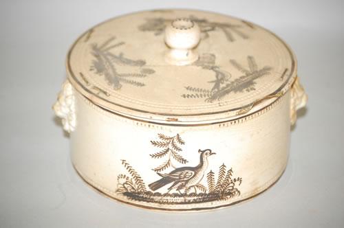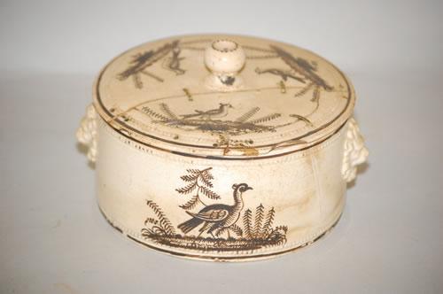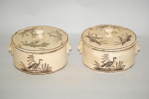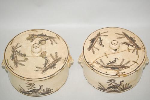 (2) DECORATED CREAMWARE COVERED BOXES - PR. ROUND CREAMWARE COVERED BOXES W/ MOLDED LION HEAD HANDLES, 3 ROWS OF MOLDED BEADED LINES & FREEHAND DECORATIONS OF BIRDS & FOLIAGE (4" T X 7" W) - HAIRLINES, LOSSES, OLD STAPLE REPAIRS, CRAZING & STAIN