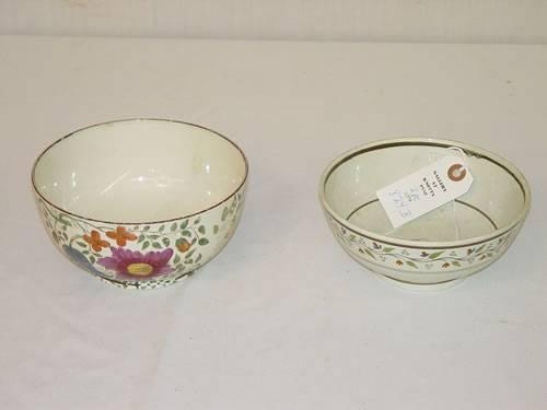 (2) DECORATED EARLY SOFT PASTE WASTE BOWLS: 6" W/ DECORATED FLORAL BORDER & 6 1/2" W/ OVERALL FLORAL DECORATION - LARGE HAS 1" HAIRLINE & WEAR;